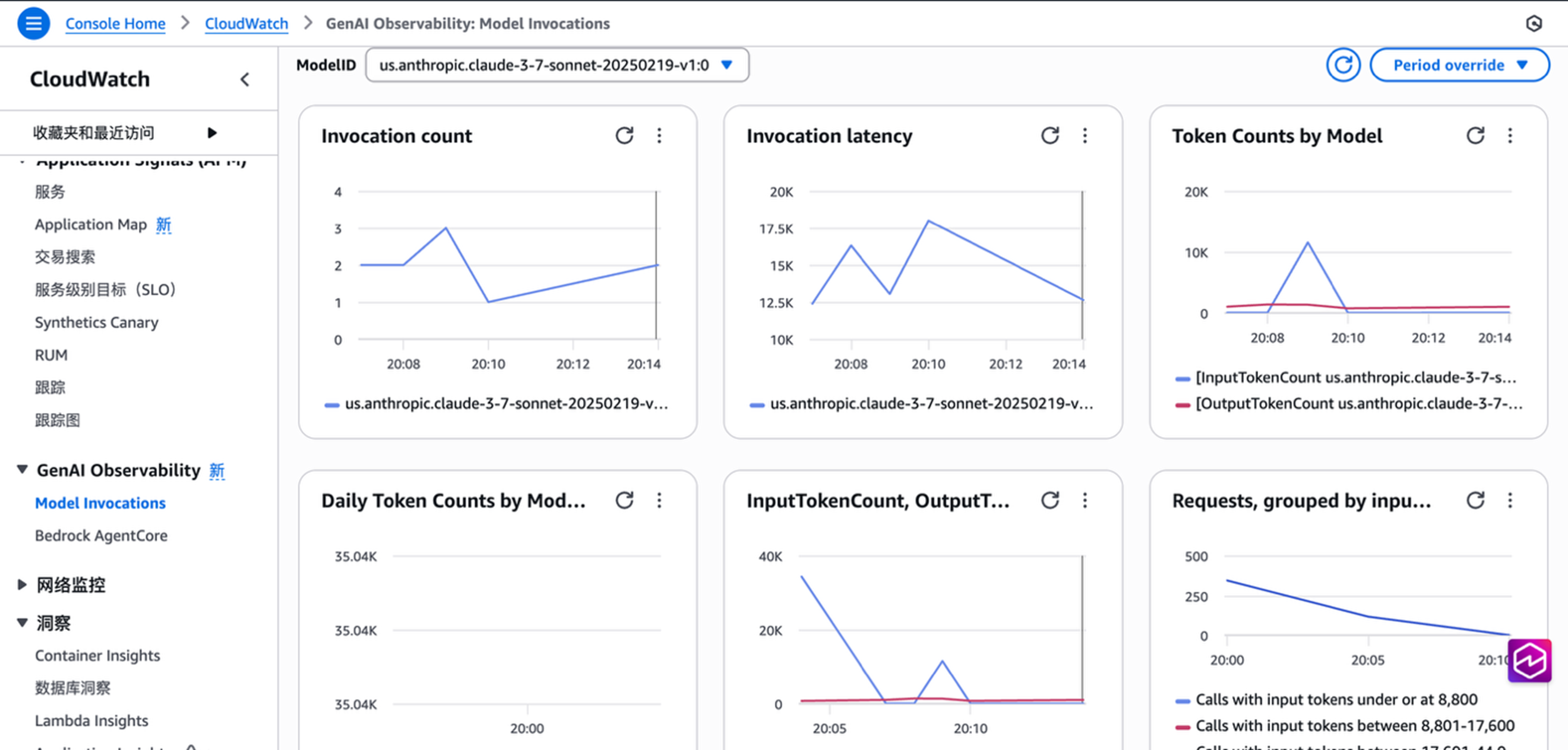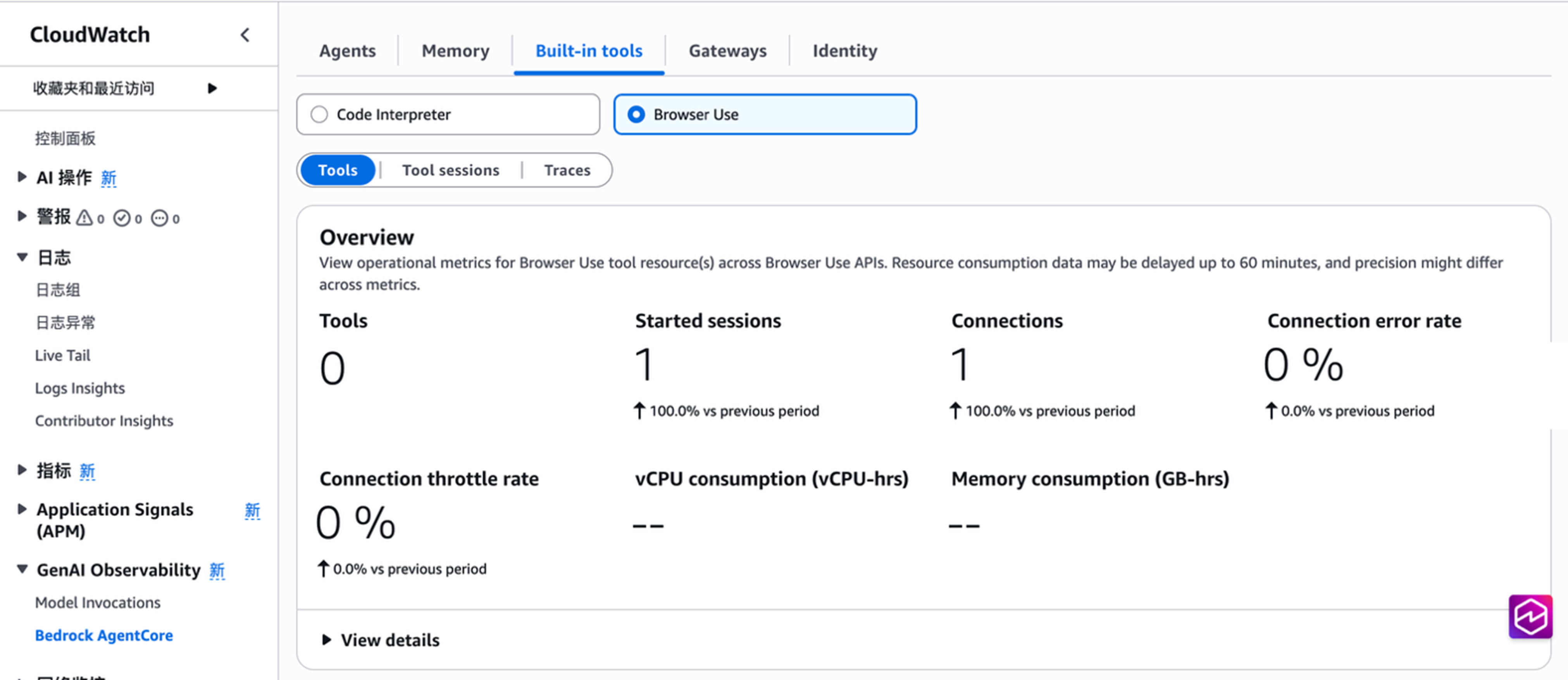 此时,在Cloudwatch监控服务的GenAI Observability下,可以看到对应的Bedrock 模型调用metric和Agentcore BrowserUse记录: