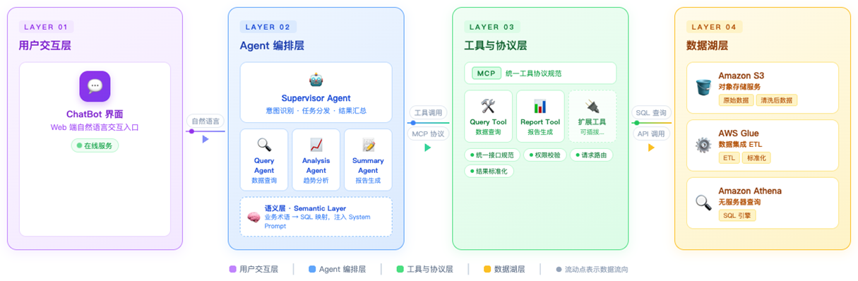 将 Agent 发出的查询请求转化为针对数据的 SQL 调用;AWS Glue 完成原始数据的 ETL 清洗与标准化;Amazon S3 分层存储原始数据与处理后数据,构成完整的数据湖查询链路。