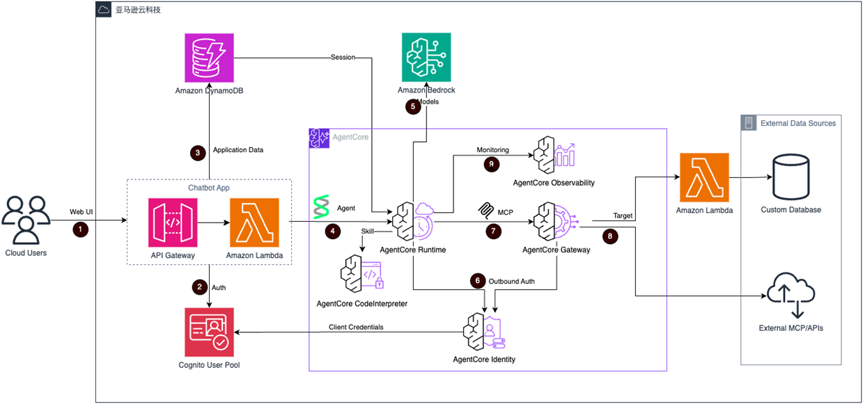 ⑨ 监控与可观测性:系统监控和可观测性通过 AgentCore Observability 服务来实现。