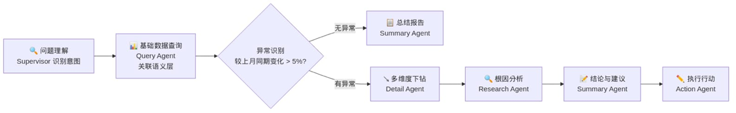 Supervisor 根据问题类型选择不同的编排路径,简单查询直接返回,复杂分析则按”基础数据 → 多维下钻 → 根因研究 → 总结建议 → 行动准备”逐步深入。新增一个分析维度或调整查询逻辑,只需要修改对应 Agent 的 system_prompt。