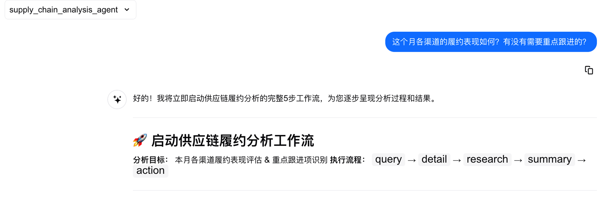 值得注意的是,这些编排规则本身就是行业经验的结构化表达——异常阈值设为 5% 而非 10%、下钻时先看渠道再看品类、什么情况下触发根因分析,这些判断来自供应链运营团队的实际经验,而非 Agent 自行推断。配置驱动的设计让这些经验可以被显式管理和持续迭代。