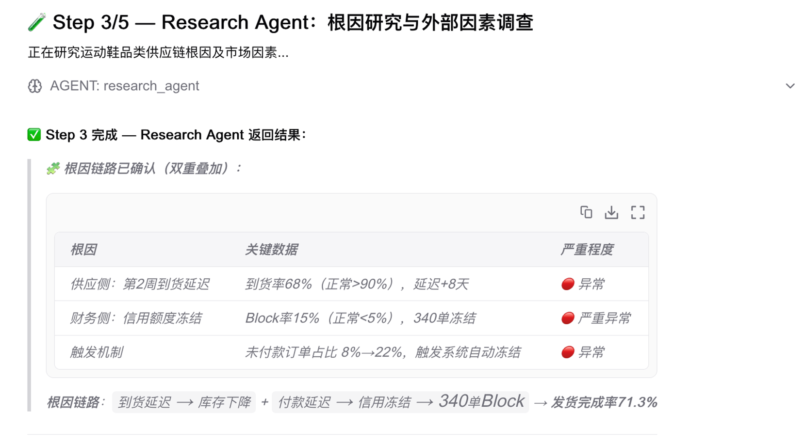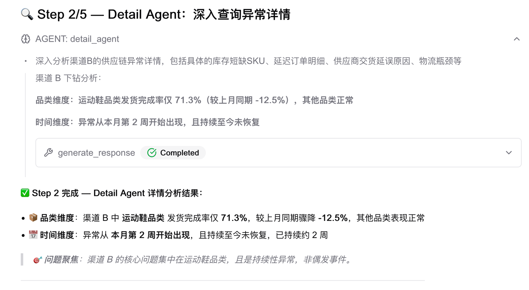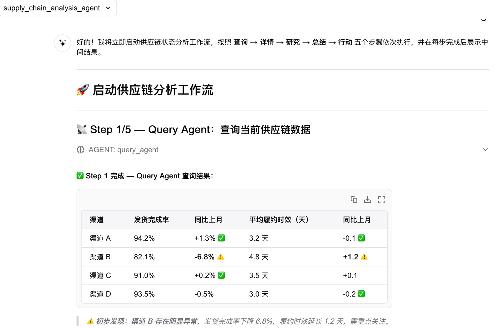 Query Agent 自动将”履约表现”映射为语义层中定义的核心指标(发货完成率、平均履约时效),按渠道维度查询本月截至当前的数据,并与上月同期对比。Supervisor 识别到渠道 B 的发货完成率较上月同期下降超过 5%,判定为异常,自动进入下钻分析。