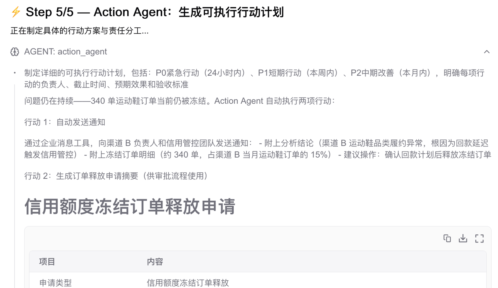 - Action Agent:将分析洞察转化为可执行的行动(如发送通知、创建工单、生成审批材料等)