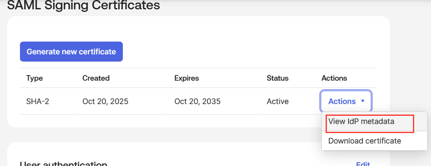 点击Save之后,在下方的SAML Signing Certificates中,点击Actions,选择View IdP metadata,此时会弹出新页面,右键选择Save Page As,保存成文件metadata。
