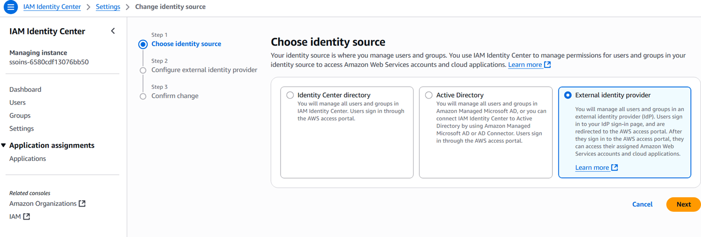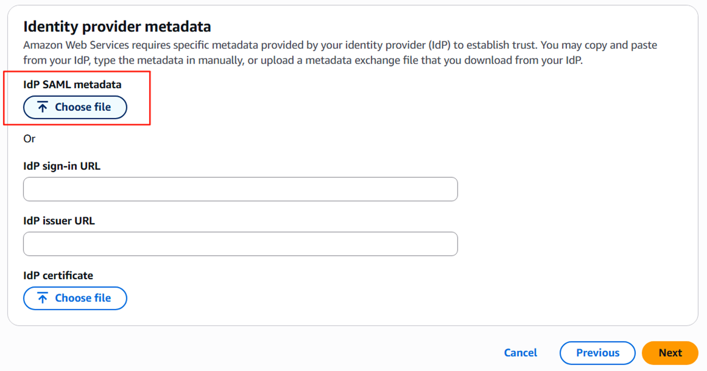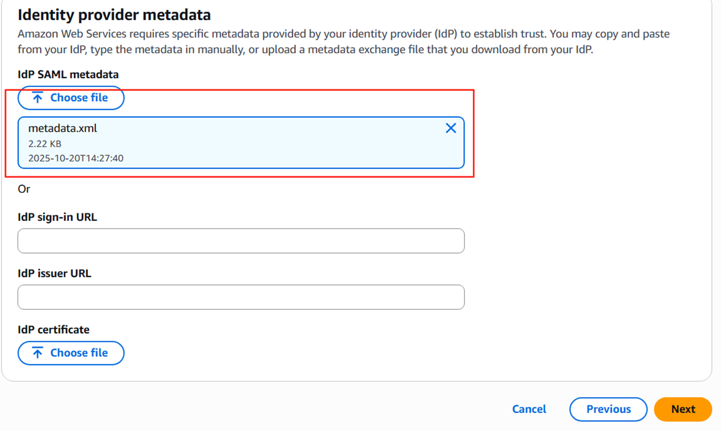 转到刚才的亚马逊云科技控制台,在Identity provider metadata下,点击Choose file,选择上文保存的metadata文件:
