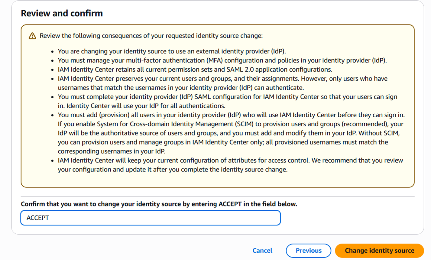 打开亚马逊云科技的控制台,进入IAM Identity Center。(此处已省略创建IAM Identity Center的初始步骤。)在Settings中,点击Actions,选择Change identity source:
