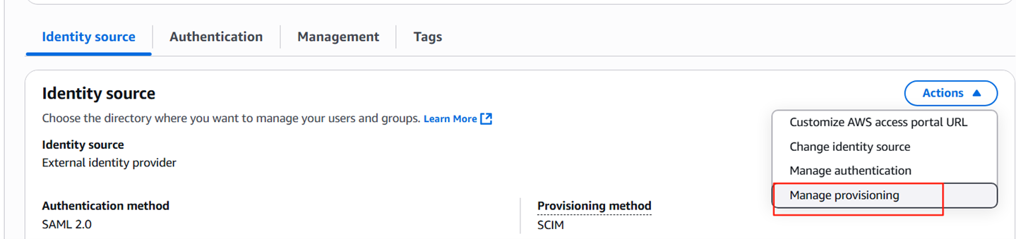 继续在IAM Identity Center的Settings下,点击Actions,选择Manage provisioning。
