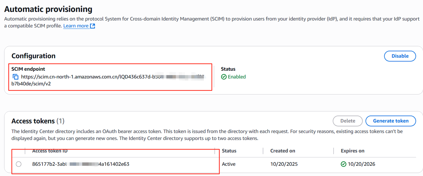 在Automatic provisioning中创建Access token,记录下该token和SCIM endpoint。这里解释一下SCIM:SCIM(System for Cross-domain Identity Management)是一个开放标准协议,它定义了一套RESTful API标准,旨在简化用户身份在不同系统间的创建、更新、删除和查询操作。
