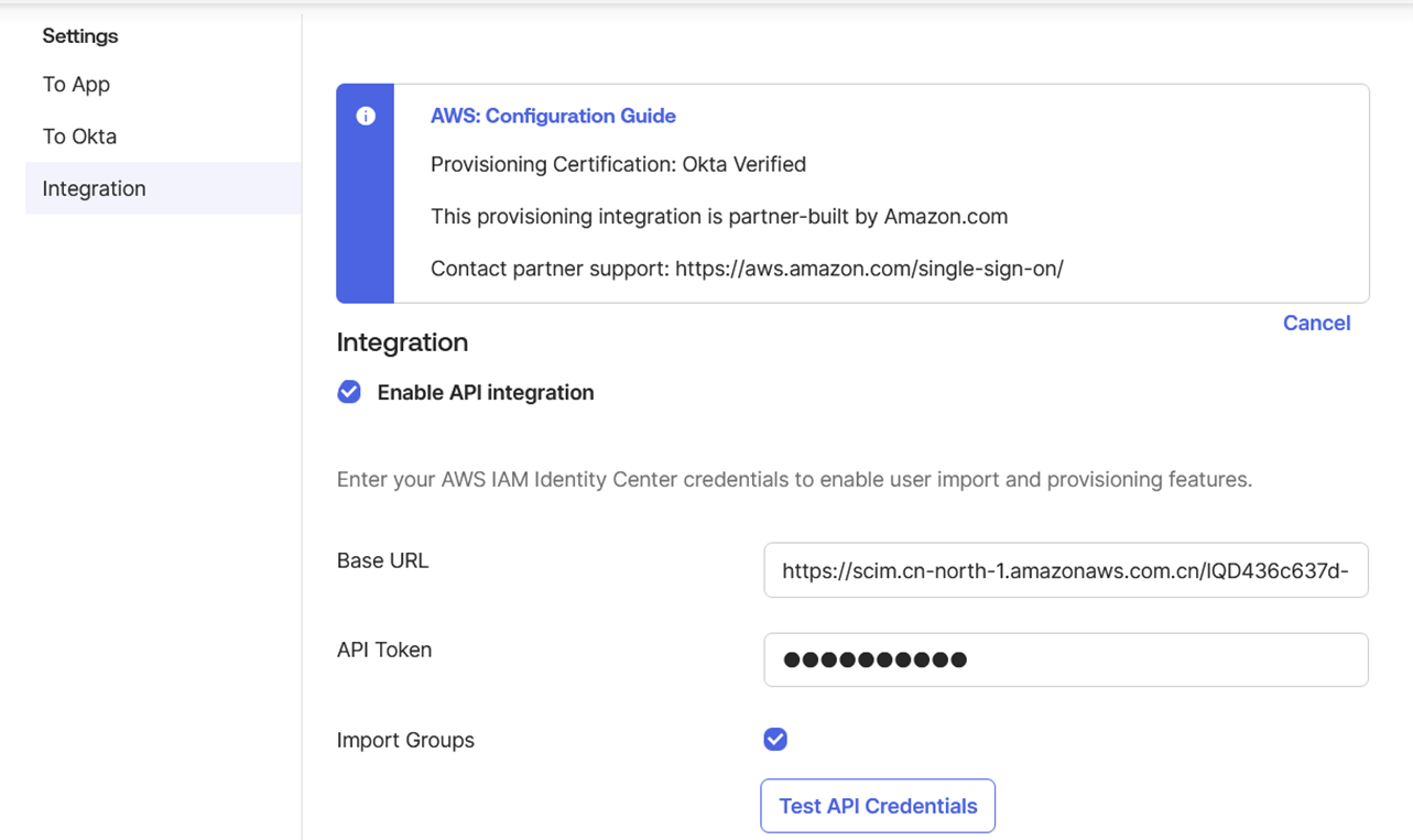 接下来回到Okta界面,进入Provisioning,点击Configure API Integration,然后在Base URL和API Token处填入上文记录的SCIM endpoint和Token的值。填完之后,点击Test API Credentials,如果验证成功,则可以继续下面操作。