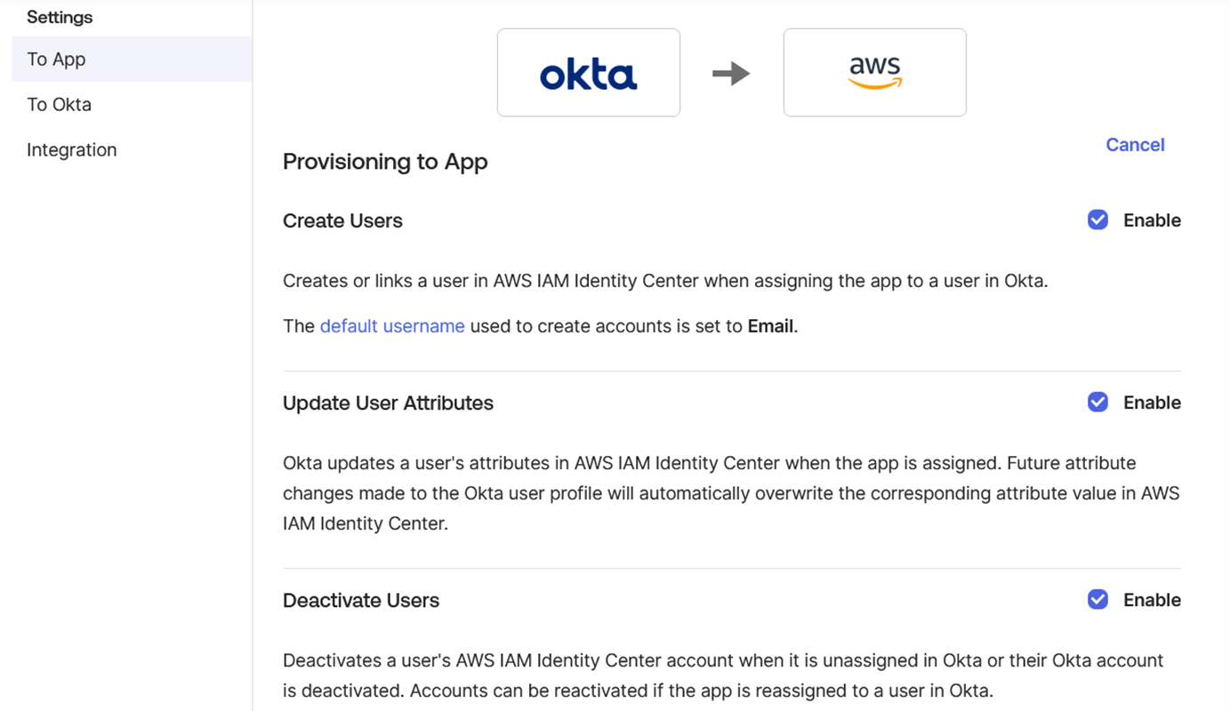 如果顺利完成验证,则可以继续确认To App栏目中,Create Users, Update User Attributes和Deactivate Users都已经Enable了。这样保证在Okta这边用户的变化可以及时同步到IAM Identity Center中。