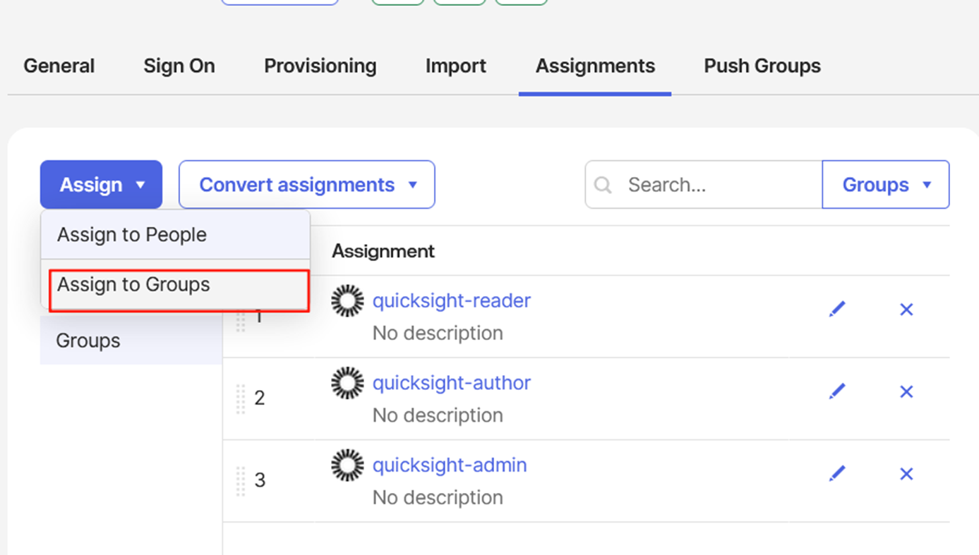 在Okta界面中进入Assignments,点击Assign,选择Assign to Groups。然后选择这三个quicksight的组。