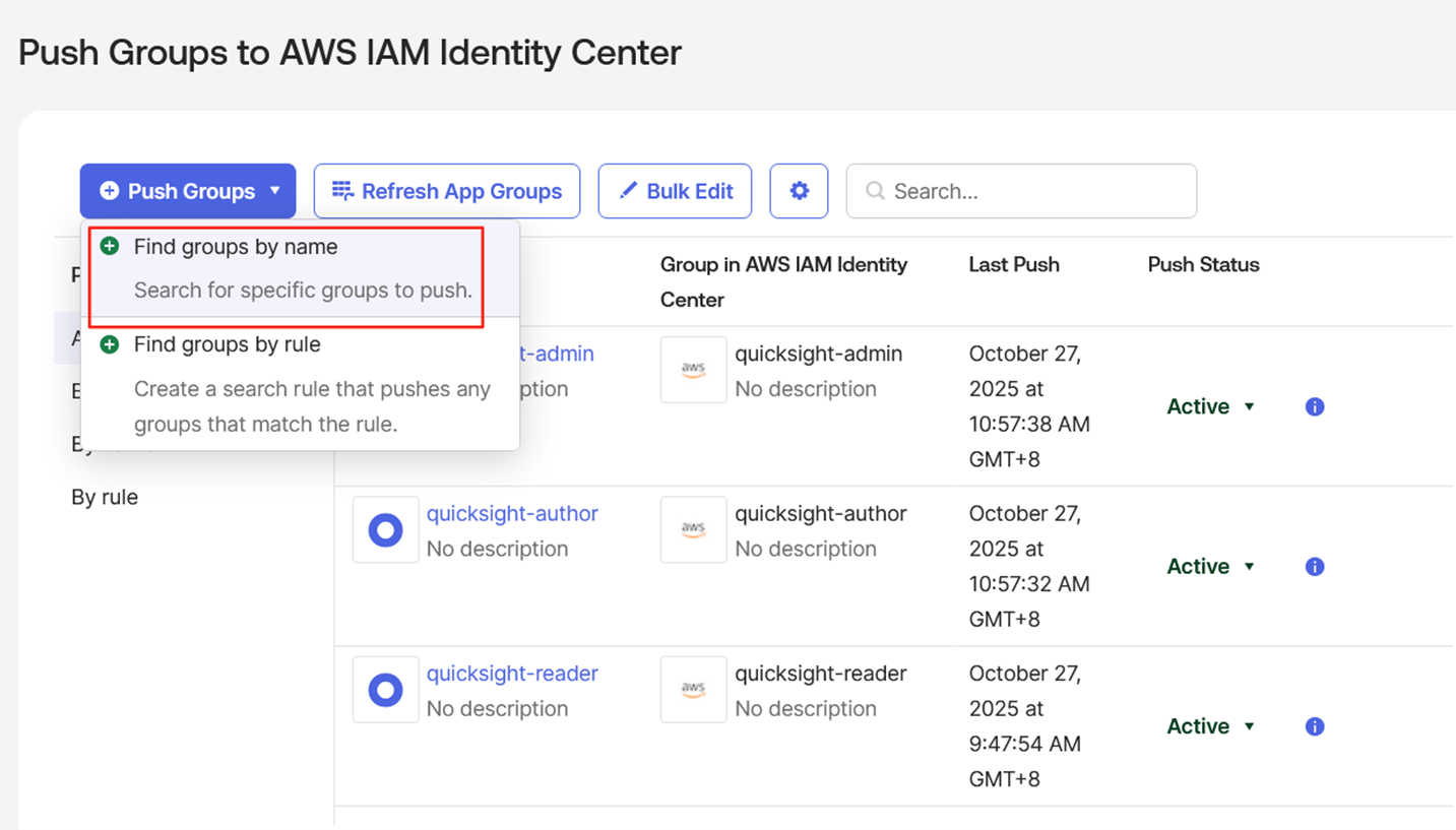 接下到Push Groups界面,点击Push Groups按钮,选择Find groups by name,依次把三个quicksight的组添加进去,查看Push Status状态,等都变成Active。