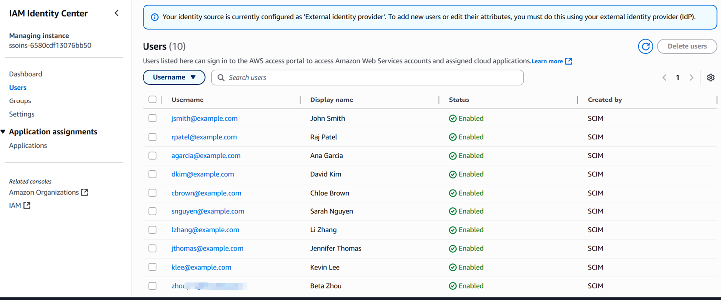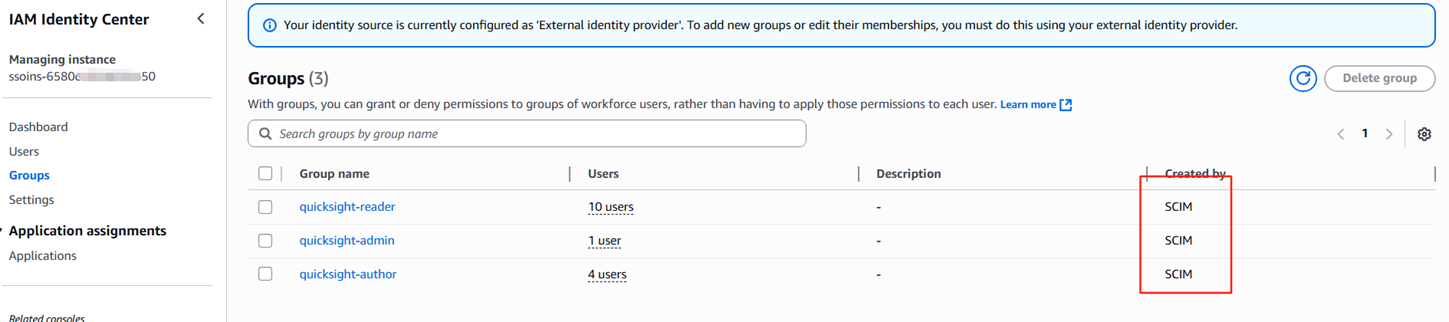 这时转到亚马逊云科技控制台,在IAM Identity Center的Groups里面,就可以看到同步过来的三个quicksight的组了,可以注意到它们都是Created by SCIM。这就表明这些组都是从Okta同步过来的。