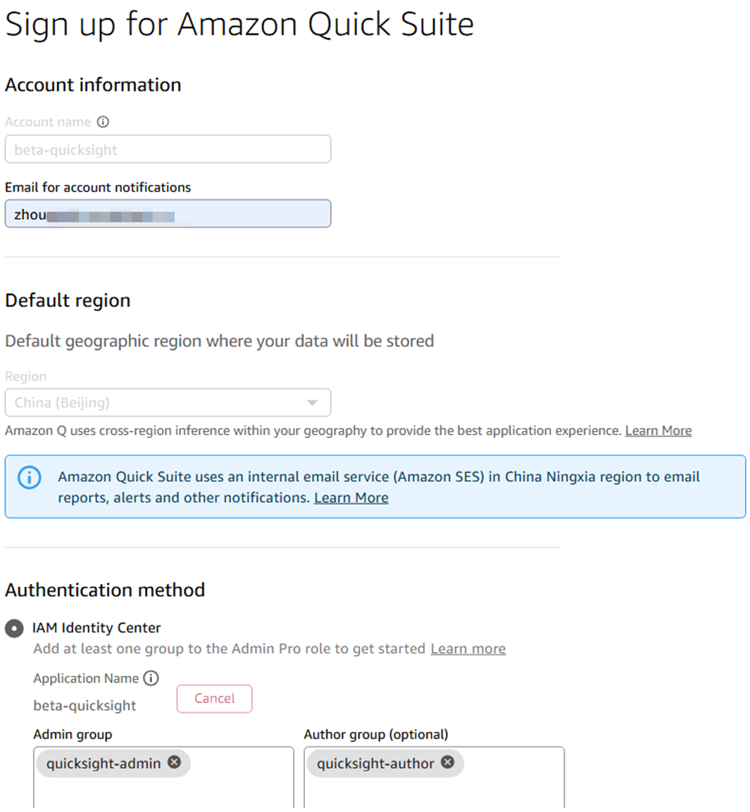 填写Account name,Email后,在Authentication Method中选择IAM Identity Center,然后在Admin group, Author group和Reader group中分别 选择quicksight-admin, quicksight-author和quicksight-reader。