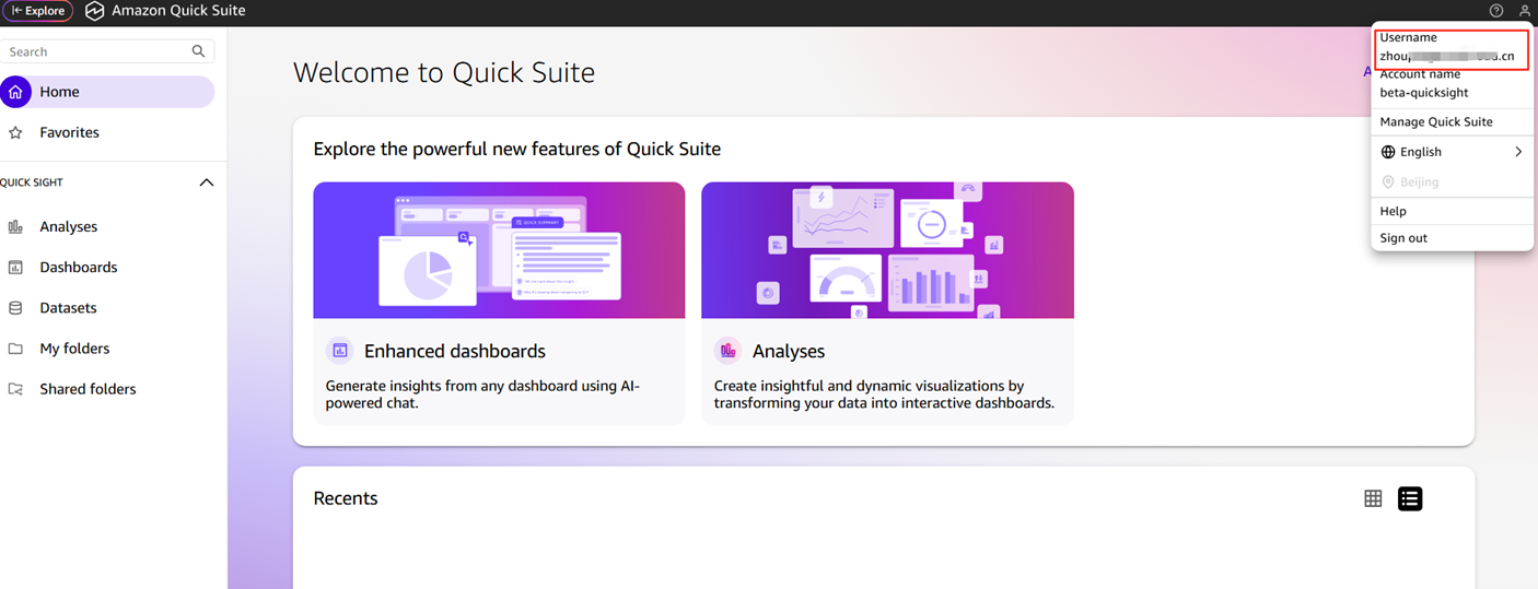 完成登录后,浏览器会再转入到QuickSight的界面(现在叫做Quick Suite):