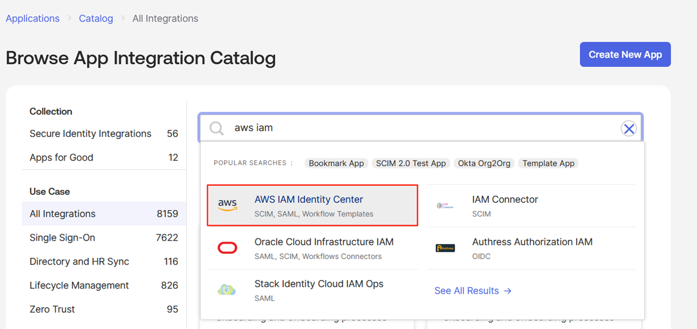 在Okta的管理界面中到Applications栏目,点击Browse App Catalog,查找IAM Identity Center,点击该图标: