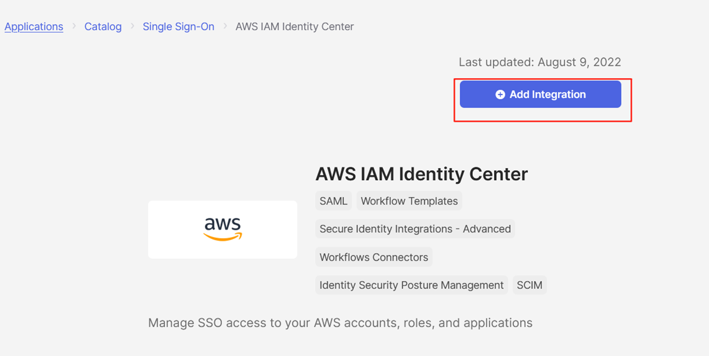 本部分将在Okta中创建IAM Identity Center应用,用于完成认证。此过程需要同时操作Okta管理界面和Amazon Web Services的控制界面。