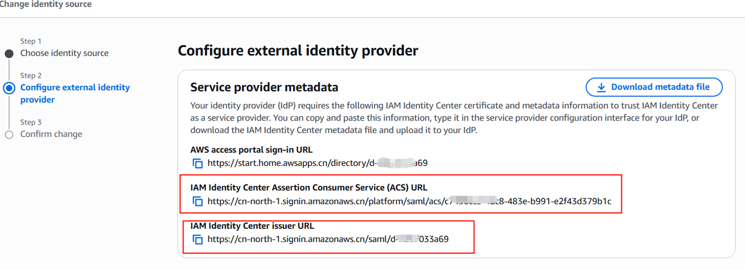 在下一步的界面中,记录IAM Identity Center Assertion Consumer Service (ACS) URL和IAM Identity Center Issuer URL。前者是SAML断言的接收端点,在Okta完成用户认证后会把包含用户身份信息的SAML断言发送到此地址。后者用于唯一标识SAML服务提供商,此处就是IAM Identity Center实例。