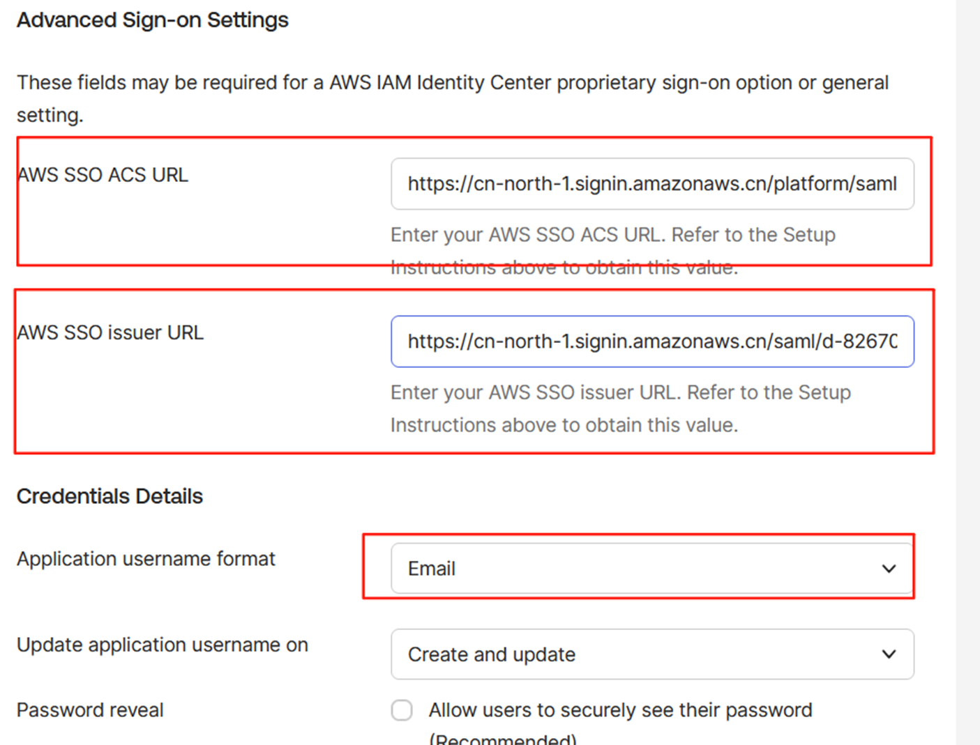 转到Okta新创建的应用中,点击Sign On栏目,点击Edit,在Advanced Sign-on Settings下填写上个步骤记下的两个URL。同时把Application username format改成Email。这样后续在IAM Identity Center看到同步过来的用户名就是Email格式。