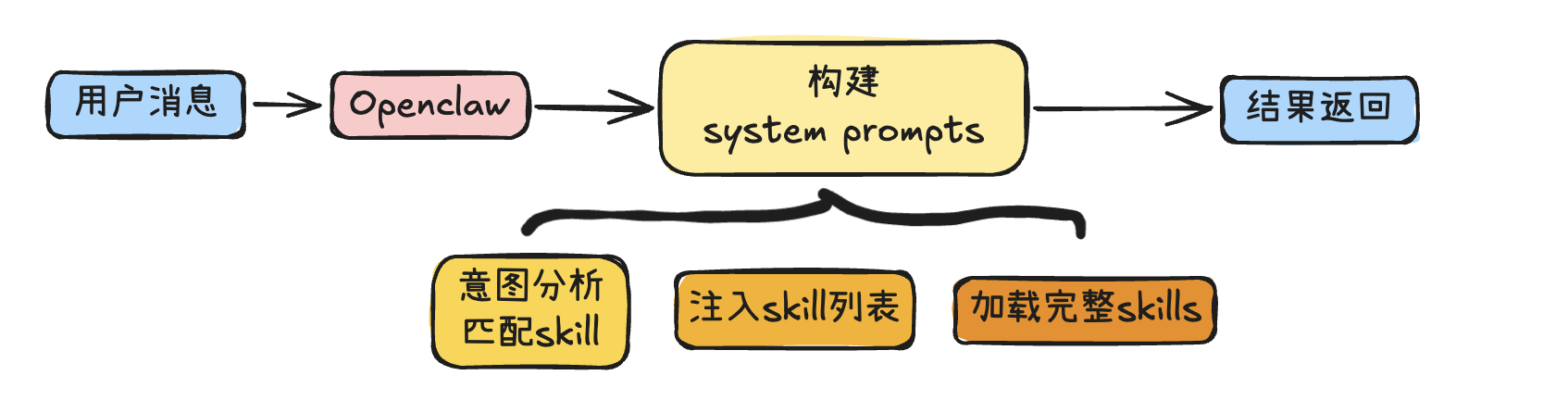 - 构建 available_skills XML 块,注入到消息体的 bodyForAgent 字段