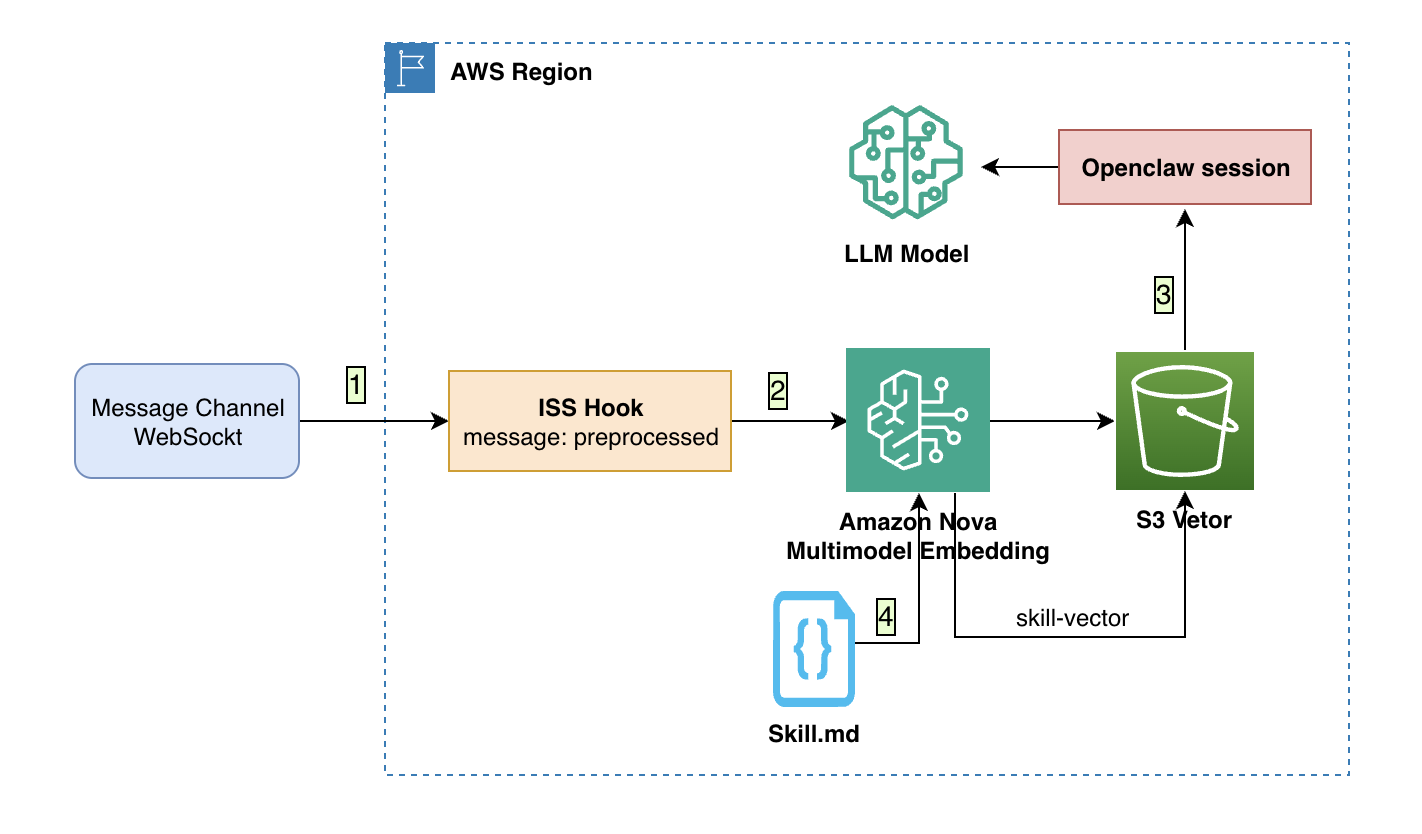 本文介绍一种针对 OpenClaw 的智能Skills召回方案ISS (Intelligent Skill Selection),基于 Amazon Bedrock Nova Multimodal Embeddings 和 Amazon S3 Vector,通过向量语义检索实现skill按需召回,将每次对话注入的技能描述 Token 降低约 90%,并提升响应速度。其中: