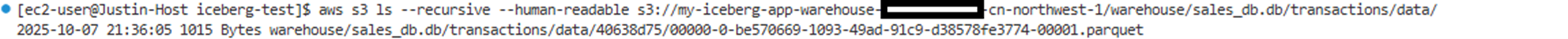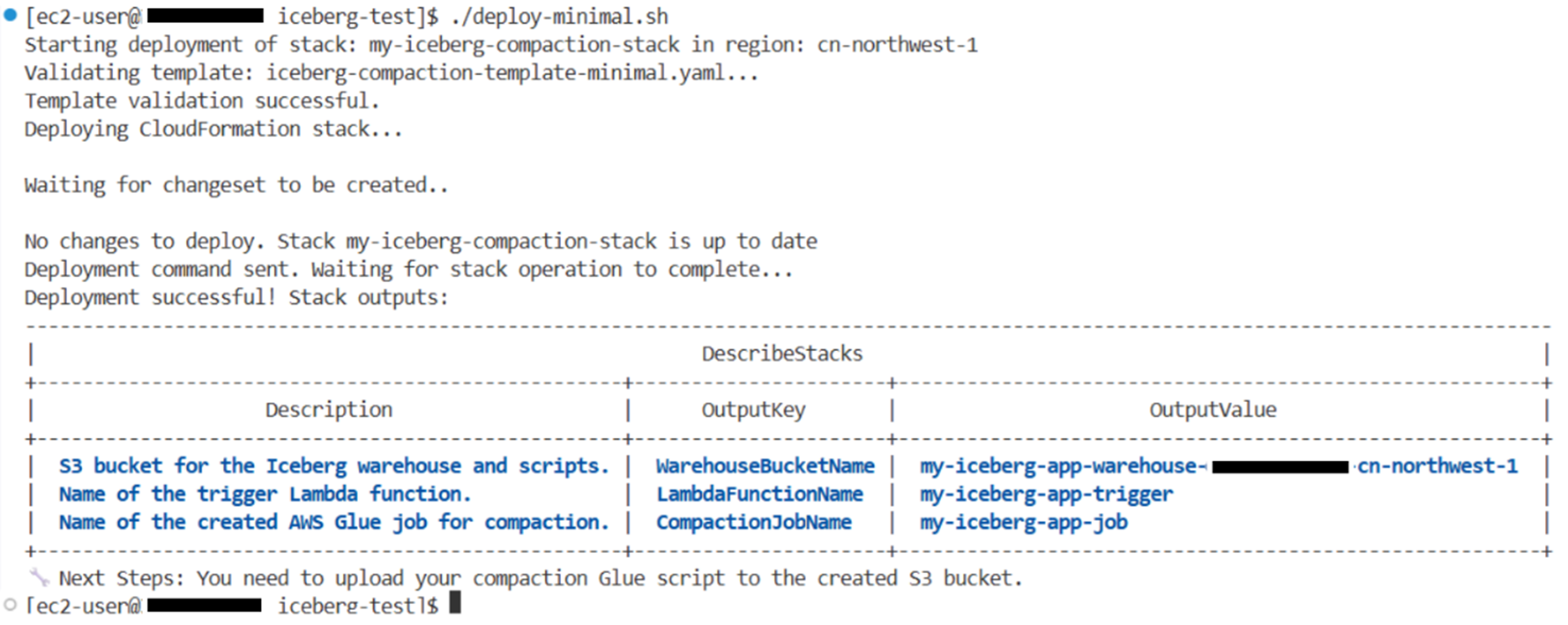 首先需要确保您已经成功部署了上面提到的CloudFormation堆栈,即使用之前提供的 deploy-minimal.sh和iceberg-compaction-template-minimal.yaml成功创建了CloudFormation堆栈,如在宁夏区域部署了“my-iceberg-compaction-stack”。从CloudFormation堆栈的输出中,记录好WarehouseBucketName的值,如“my-iceberg-app-warehouse-<accountID>-northwest-1”。