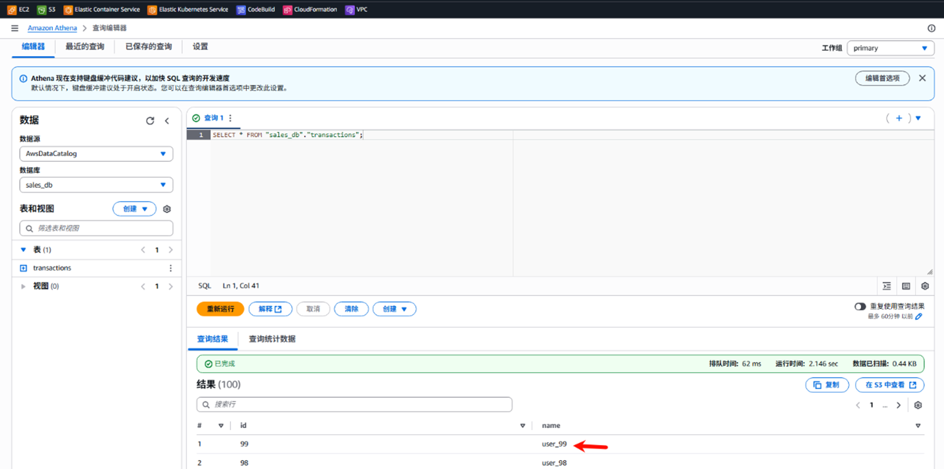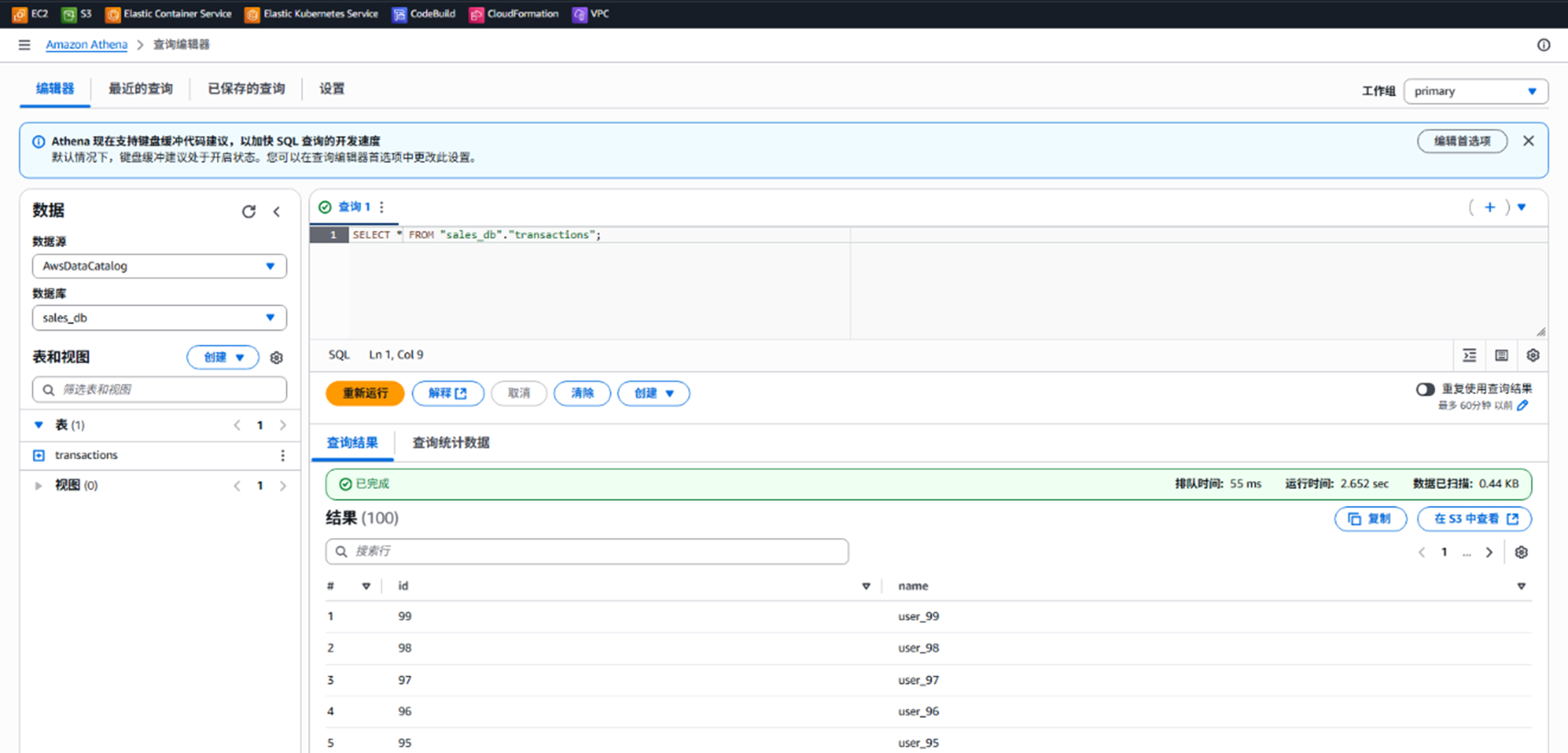 从Athena进⾏查询SELECT * FROM “sales_db”.”transactions”;可以得到如下类似结果,并且可以看到之前创建的100条记录已经全部合并入一个大文件中。
