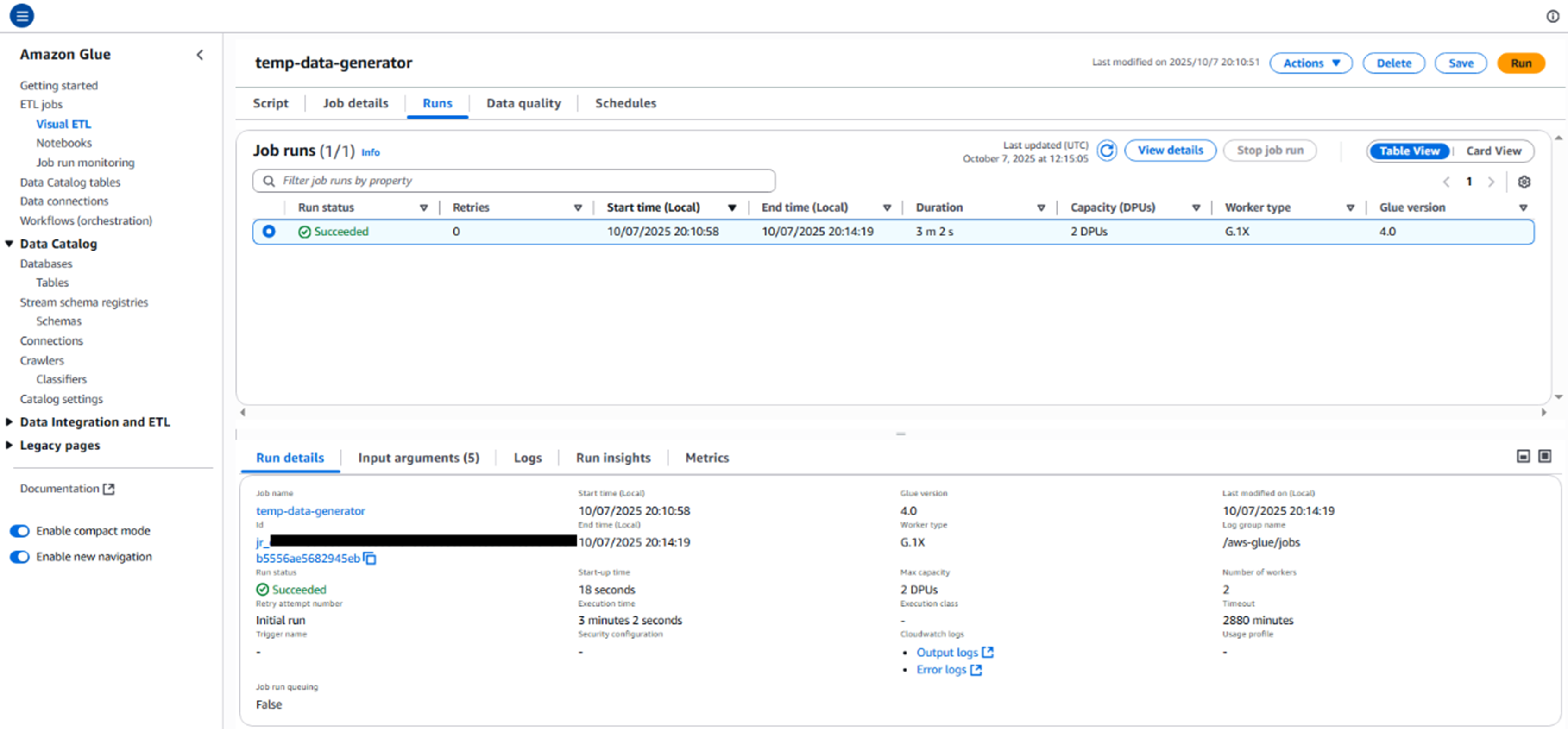 之后便可以开始创建测试数据,来模拟小文件问题的场景了。创建一个名为create_small_files.py的文件,作为数据生成的Glue脚本。示例文件请参照本文4.4章节。这个脚本将创建一个 Iceberg 表,并循环写入100次(您可以通过修改脚本以自定义循环次数),每次只写一条数据,从而在S3桶中模拟生成100个小文件。将该脚本上传到s3桶的scripts目录下。然后使用如下Amazon CLI命令创建Glue job,并替换您的角色 ARN 和 S3 桶名。执行完成后,该命令会启动一个名为temp-data-generator的Glue Job,用来生成大量小文件。