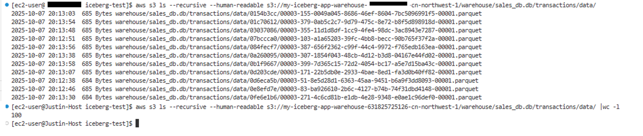 然后使用s3命令可以看到S3桶中已经生成了100个parquet格式的小文件。
