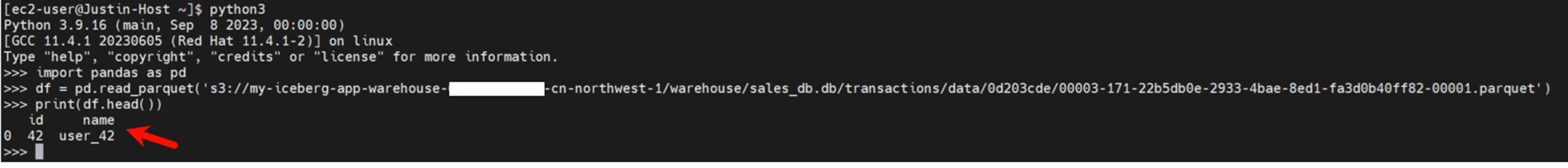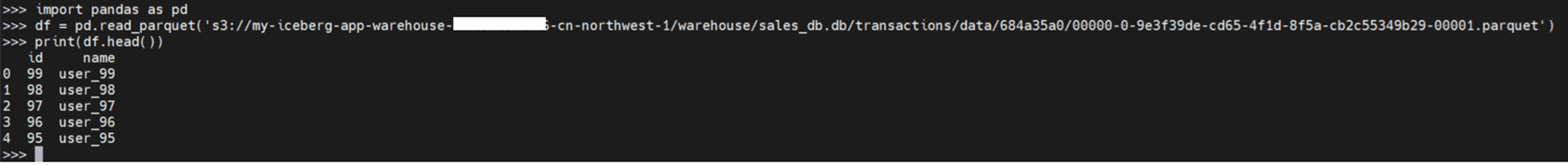 执行完成后,可以看到Glue Job被成功触发,执行结果为Success,并在S3桶里新生成了一个如下的文件,名为warehouse/sales_db.db/transactions/data/684a35a0/00000-0-9e3f39de-cd65-4f1d-8f5a-cb2c55349b29-00001.parquet,大小为1015字节。用Python打开该文件可以看到如下内容,有5条数据。