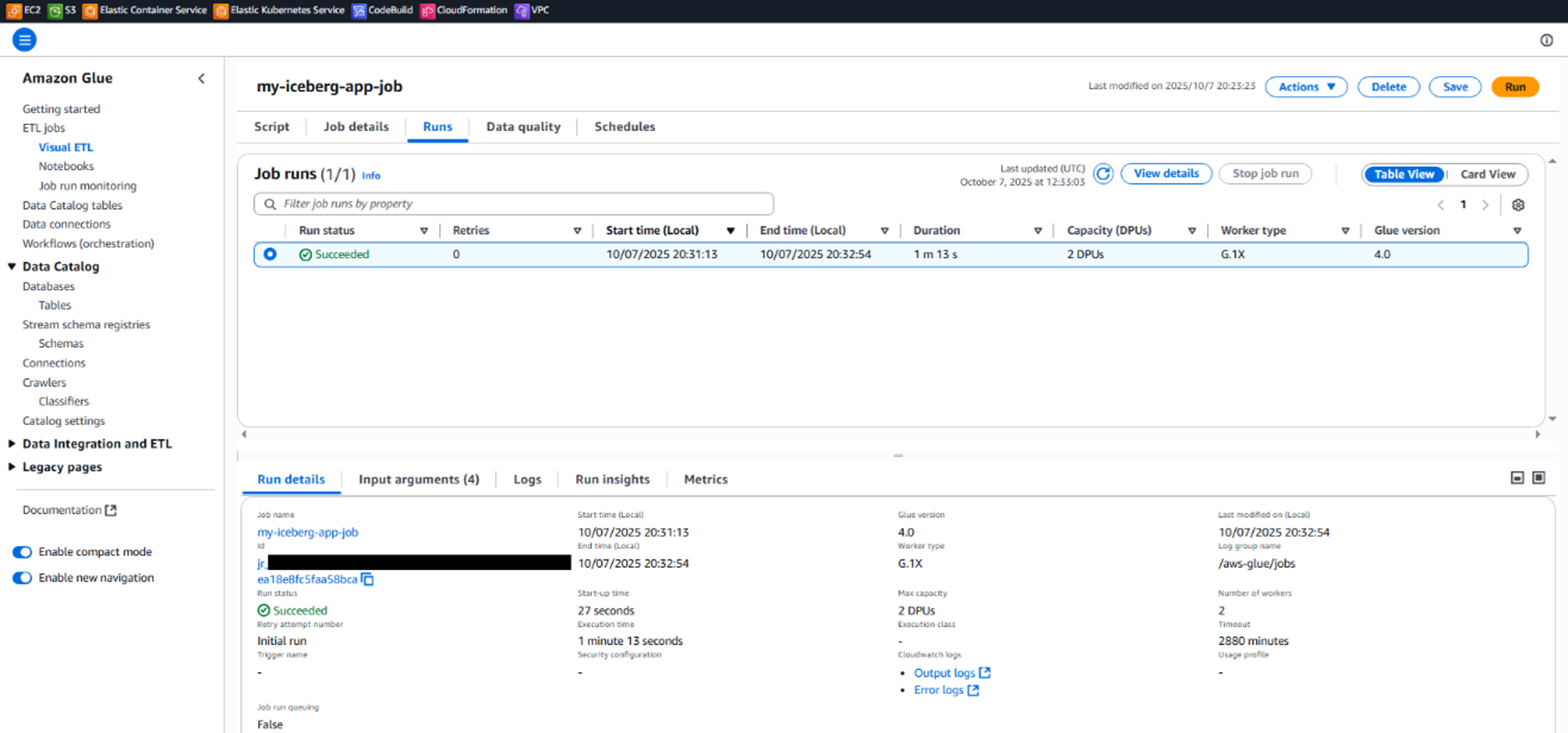 请注意,在–conf中需要添加catalog-impl和io-impl两个参数,告诉Iceberg在执行Glue job时不要连接默认的Hive Metastore服务来管理表的元数据,而使用Amazon Glue Data Catalog作为元数据存储。即catalog-impl参数指定元数据目录为Amazon Glue Data Catalog,io-impl指定读写数据文件时使用专门为 S3 优化的I/O实现。然后使用如下命令执行Glue Job。这个命令会返回一个JobRunId,表示任务已经开始执行。用户可以进入Amazon Glue控制台监控该任务的运行状态,等待它成功完成。