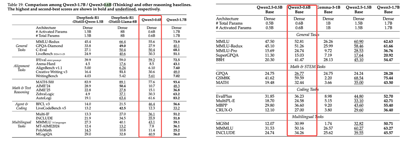 根据图1官方评估结果,Qwen3 0.6B 在多个评测基准上的表现甚至超过了参数量更大的模型。在 MMLU 任务中,Qwen3 0.6B 获得了 52.81 的分数,在 Math & STEM 类任务的 GPQA 测试中得分 26.77,在 Coding 类任务的 EvalPlus 中达到 36.23 分。这些数据充分体现了模型在通用语言理解、数学推理和代码生成等多个维度的综合能力。对比 Gemma-3-1B(1B 参数)和 Qwen2.5-1.5B(1.5B 参数)等更大规模的模型,Qwen3 0.6B 在某些特定任务上展现出相当甚至更优的性能,证明了其训练和优化策略的有效性。