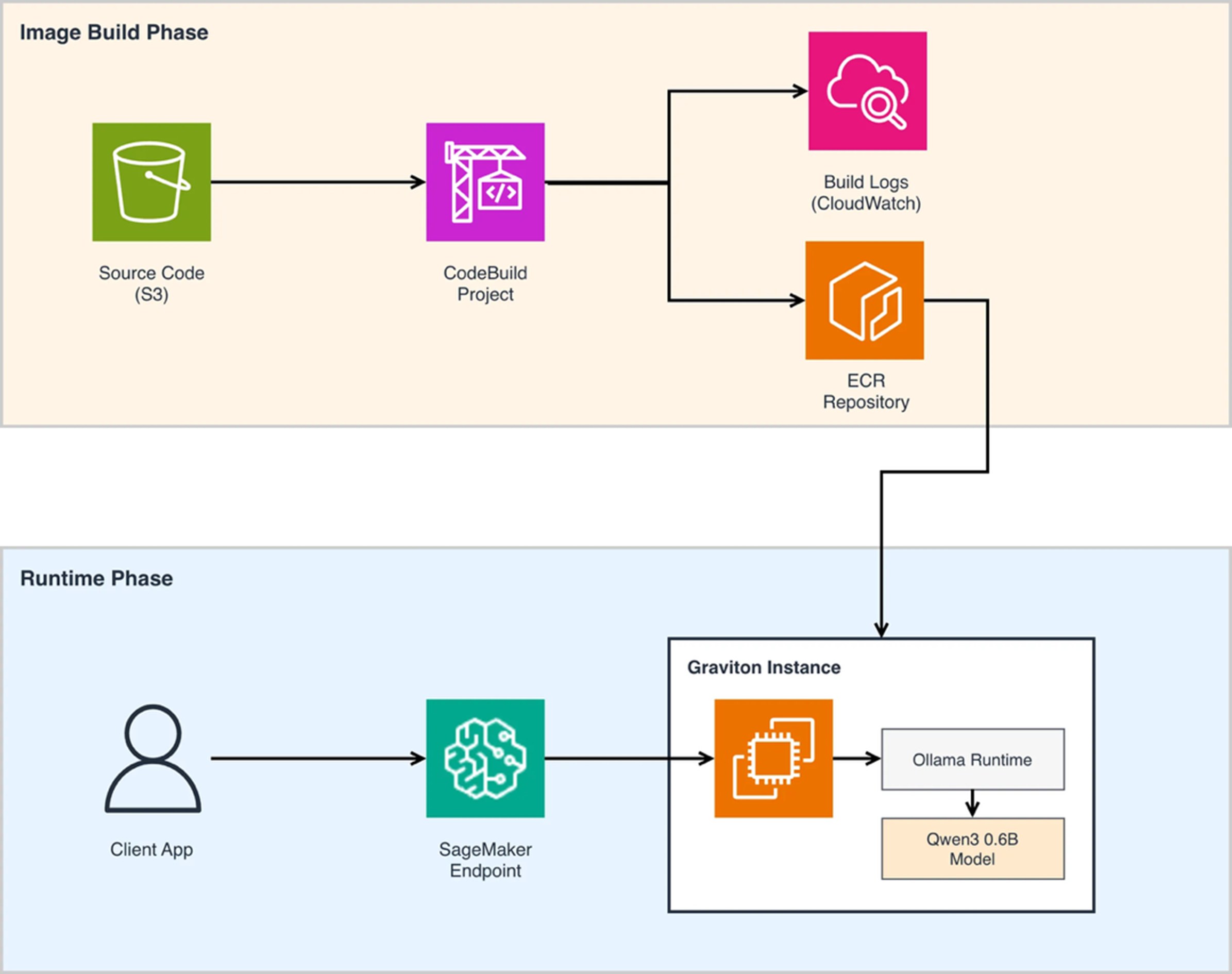 在运行时阶段(Runtime Phase),客户端应用通过 Amazon SageMaker Endpoint 发起推理请求。SageMaker Endpoint 将请求路由到运行在 Graviton 实例上的容器。在 Graviton 实例内部,Ollama Runtime 负责模型的加载和推理执行,Qwen3 0.6B 模型以优化的方式运行在 ARM 架构上。这种架构使得推理服务可以充分利用 SageMaker 的自动扩缩容、流量分配和模型版本管理等能力。