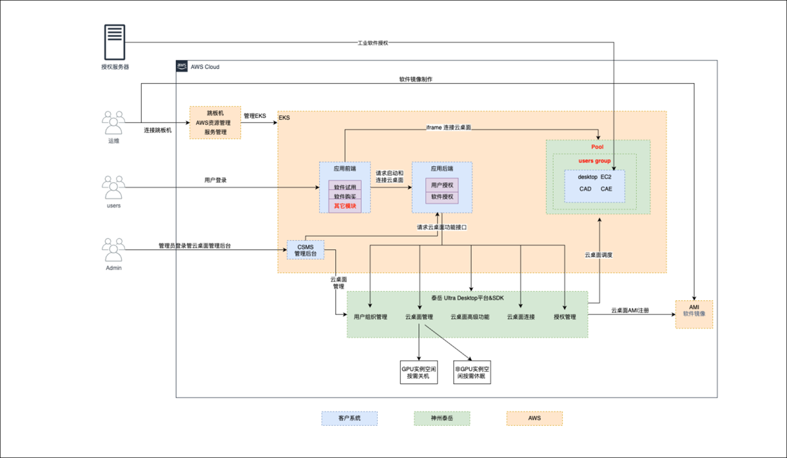 解决方案在AWS上构建,需要通过整合一套完整的基于浏览器的云桌面方案。云桌面方案能够提供用户组织管理、权限管理、云桌面管理和调度、云桌面高效连接以及资源池、文件共享与漫游等能力和所需的SDK以及API。