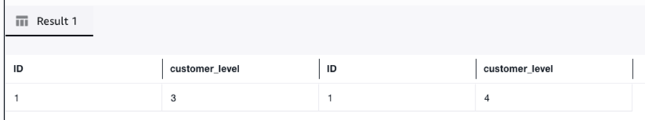 SELECT id, customer_level FROM salesdb.customer WHERE id = 1;