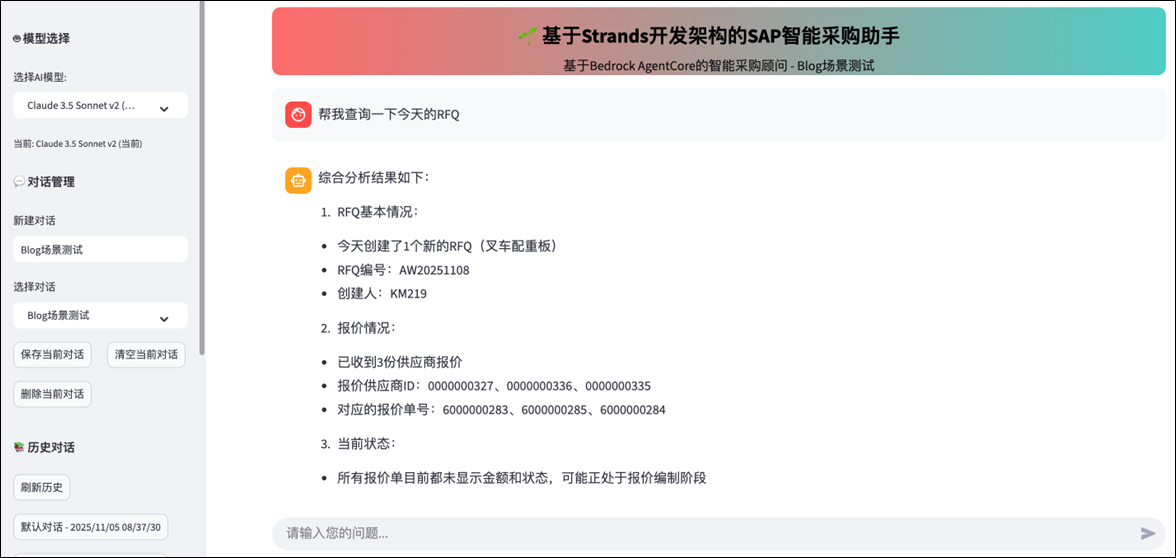 在企业采购管理中,采购人员要在SAP中进行RFQ查询、供应商信息核对、PO创建等流程操作,存在信息分散、查询效率低、流程衔接不畅等痛点。传统方式下,采购人员需在SAP系统、Excel报表、邮件等多渠道切换,不仅耗时耗力,还容易因信息不对称导致决策延迟或采购风险。本文将介绍如何通过Bedrock AgentCore Runtime, Strands Agents SDK以及Glue,实现与SAP进行数据集成,开发部署Agent,构建SAP智能采购助手的方案。