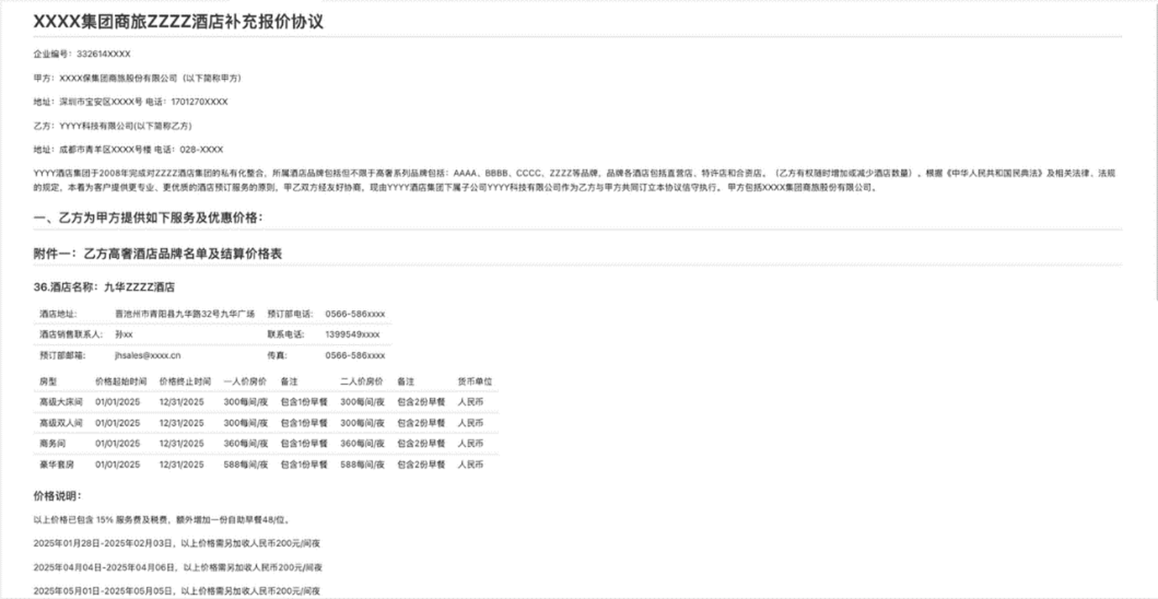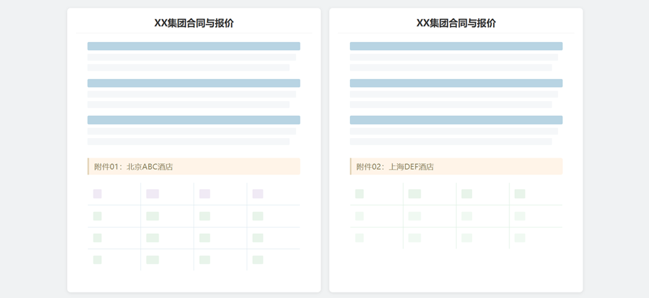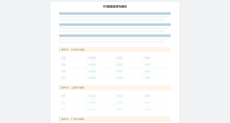 从业务角度看,在深入分析了多个长文本的合同及报价后,我们发现每份文档中“合同”部分都不是太长,在1-2页之内;但是“报价”部分会是一个长长的附件,一般以表格的形式列出集团下每个城市的不同酒店的报价信息,模式如下: