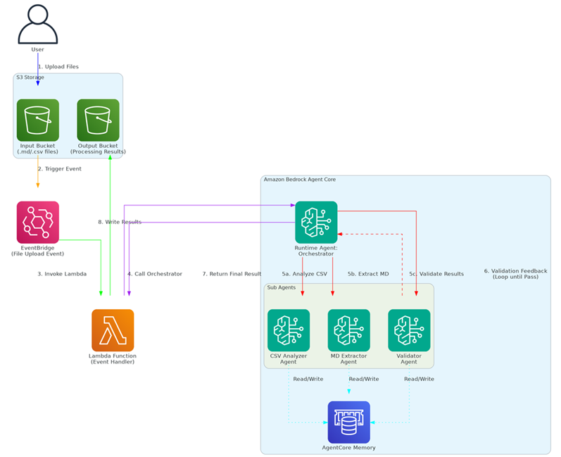 3个子Agents(CSV Analyzer Agent, MD Extractor Agent和Validator Agent)在抽取过程中还会分别跟AgentCore Memory作交互,一方面取出前次处理所积累的业务经验,提高本次的处理效率;另一方面也将本次处理所获得的新经验和不足存储在Memory中,以便后面复用。