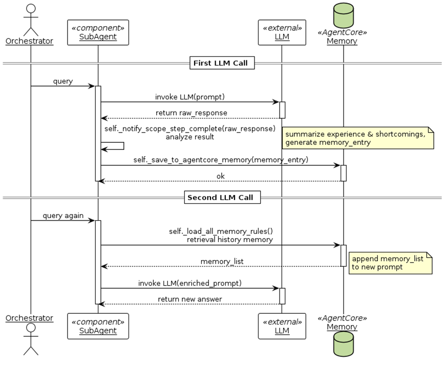 子Agent在LLM调用后,会通过self._notify_scope_step_complete()方法分析Prompt、task_description、error和LLM返回的raw_response,总结经验和不足,再将分析结果和改进思路通过self._save_to_agentcore_memory(memory_entry)写入AgentCore Memory;在下一次再调用LLM时,会通过self._load_all_memory_rules()方法从 Memory中检索相关经验,以memory_list的形式补充到Prompt中,以便有效利用前面的经验。