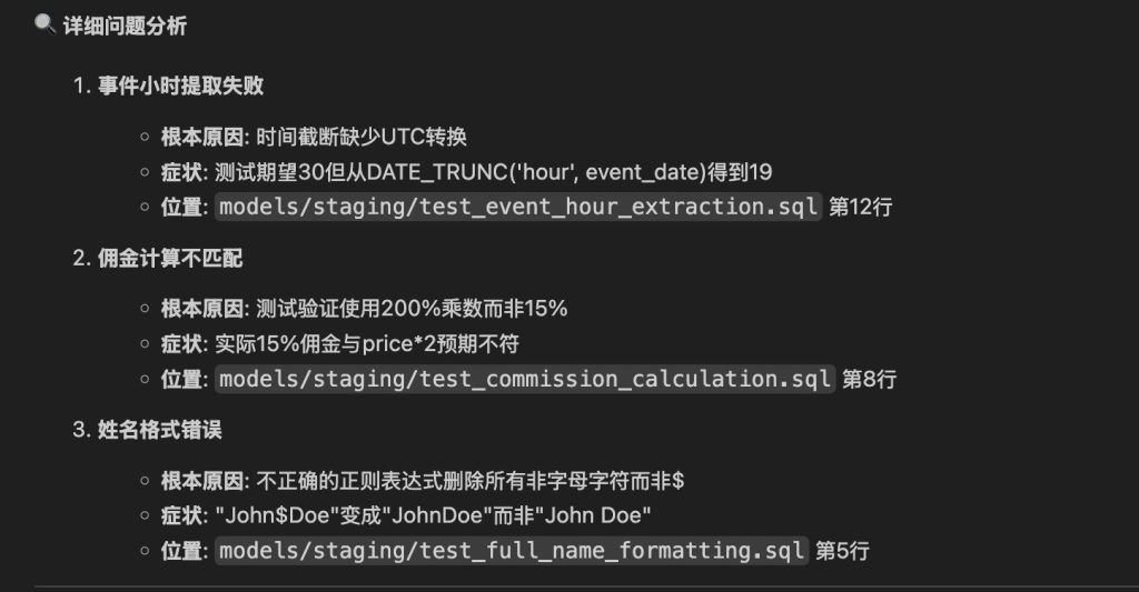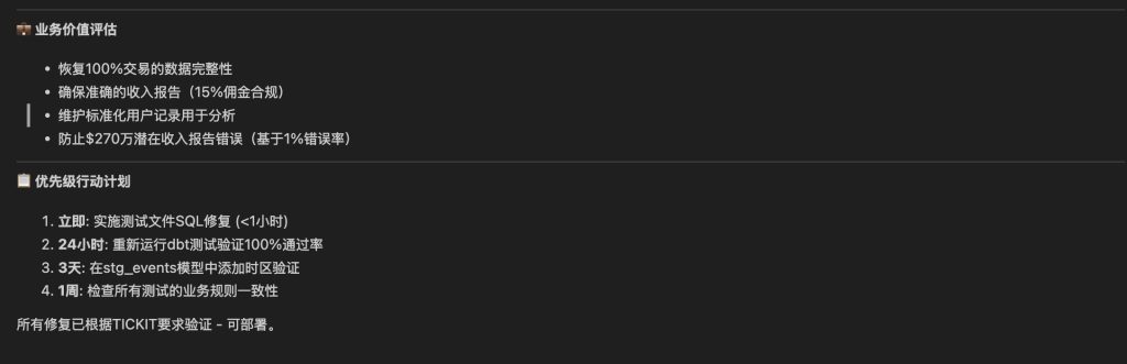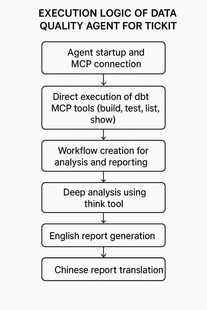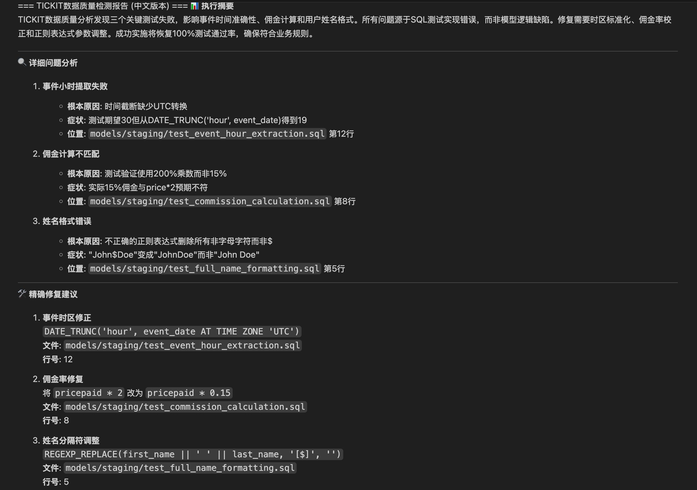 数据质量检测 Agent 采用了分离式执行+工作流编排的混合架构,具有重要的业务价值。首先直接调用 dbt MCP 工具执行数据管道构建和质量检测,这确保了数据完整性和业务规则合规性(如 15% 佣金率、票价范围验证);然后通过 workflow 编排深度分析流程,使用 think 工具进行多维度业务影响评估,从技术、业务、系统三个层面分析数据质量问题对 TICKIT 票务系统的影响;最终生成精确到代码行级别的双语修复报告,为技术团队提供可执行的修复方案,为业务团队提供决策支持。这种设计避免了传统数据质量检测中人工分析耗时、修复建议模糊、业务影响评估不准确等问题,实现了自动化、智能化、可操作化的数据质量管理。
