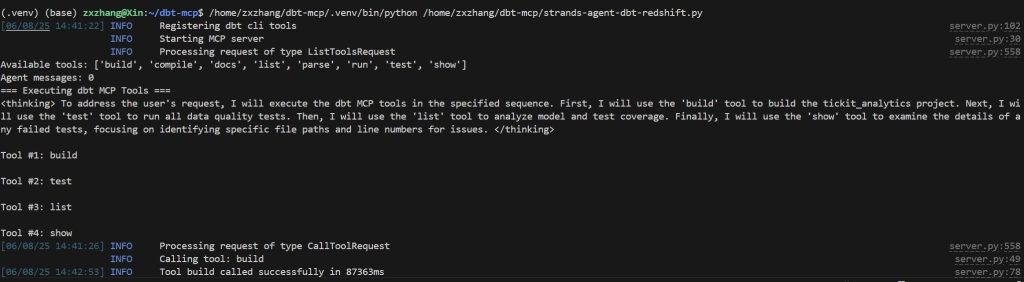 启动 Agent,查看列举了 dbt MCP Server 的工具集,并按步骤进行构建和运行测试
