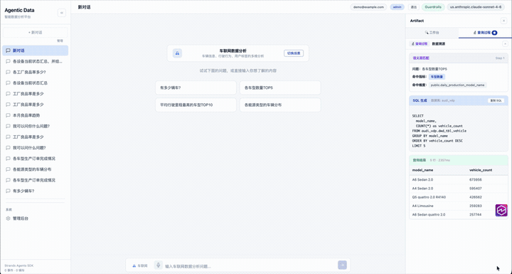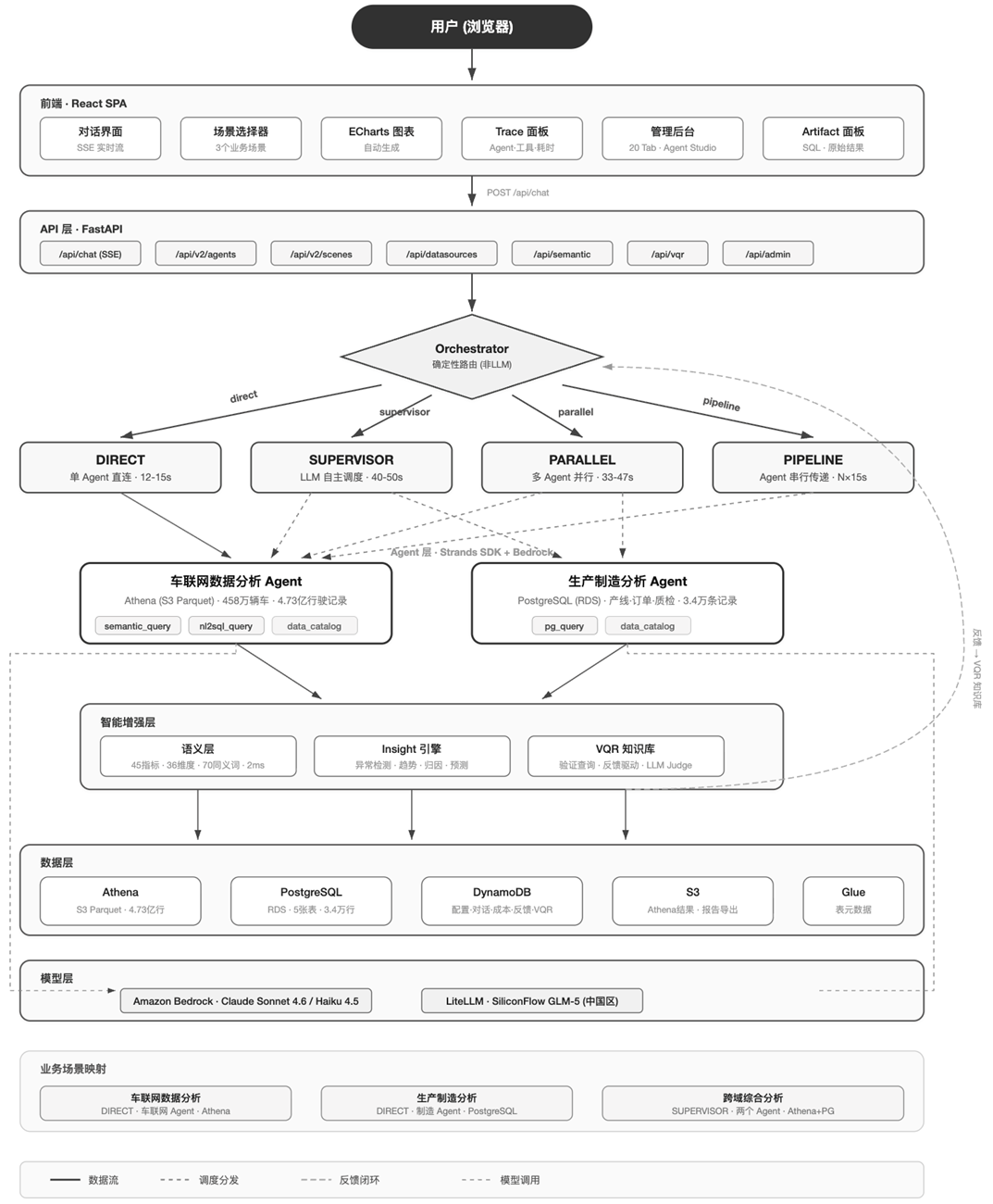 本方案示例基于汽车行业场景,包含两个数据域:车联网数据(Athena/S3 Parquet):458 万辆车、4.73 亿行驾驶行为记录,涵盖里程、油耗、驾驶评分、行程轨迹等,单表数据量达 GB 级,是典型的超大规模时序分析场景。生产制造数据(RDS PostgreSQL):5 张业务表、3.4 万条记录,覆盖产线排产、订单履约、质检工单等,是典型的关系型事务数据场景。这两个数据域覆盖了企业数据分析的两类典型挑战:海量时序数据的聚合查询(Athena/S3)和关系型业务数据的多表关联(RDS),以及跨数据源的联合分析。需要强调的是,车联网和制造只是演示场景,不是架构的约束。整个平台包括语义层、VQR、Orchestrator、Agent 编排与具体业务领域无关,可以同样的方式接入电商交易、金融风控、物流轨迹或任何 SQL 或数仓可查询的数据源,数据源的接入通过管理后台完成,无需改动代码。