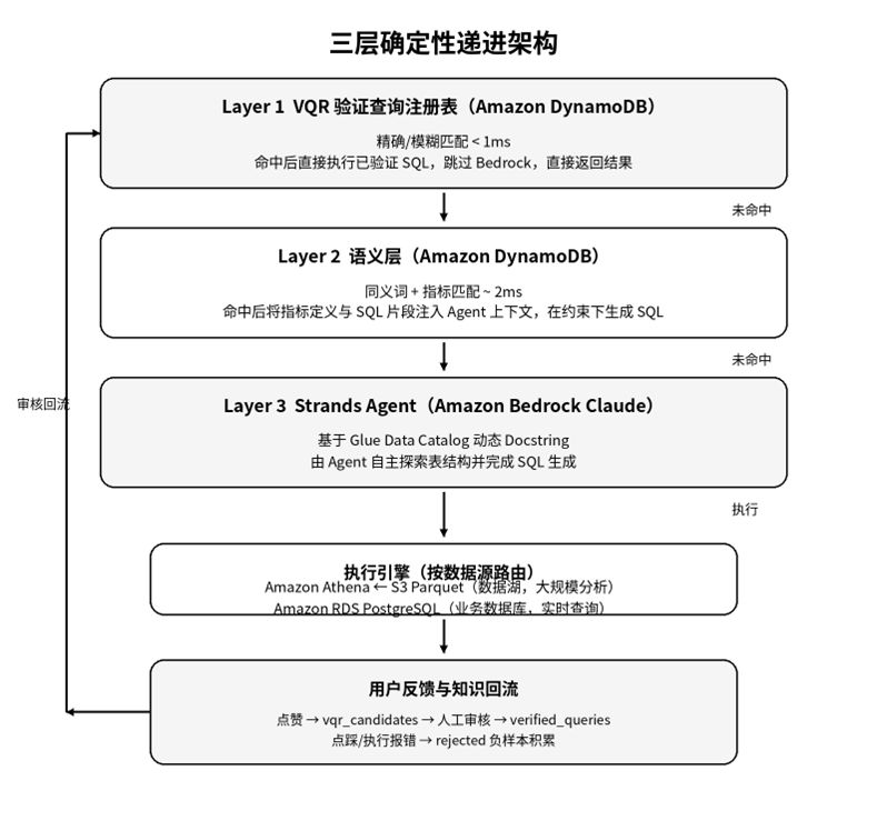 摘要:企业数据分析中,LLM 直接生成 SQL 面临不可复现、不可审计、不可收敛三大挑战。本文提出基于 Strands Agents SDK 和 Amazon Bedrock 的三层确定性架构:语义层将业务术语映射为标准 SQL 片段(毫秒),VQR 知识库通过反馈飞轮缓存验证查询(零 LLM 调用),Agent 层处理长尾问题。明显降低高频查询响应。