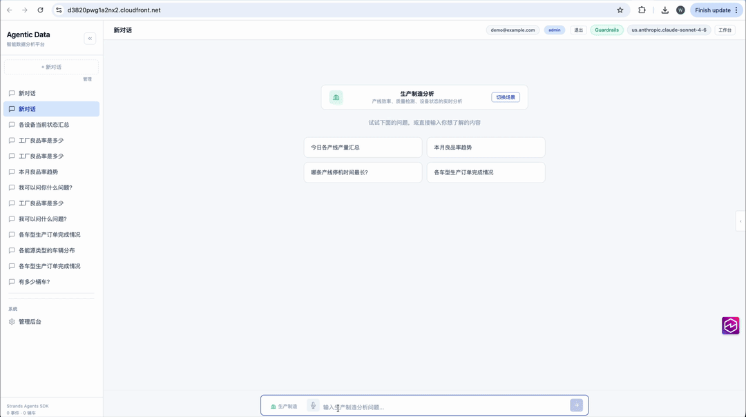 本方案基于 Strands Agents SDK 和 Amazon Bedrock 构建的Agentic架构的数据分析平台。它的核心设计目标是:让自然语言查询像固化报表一样可靠,同时保留 AI 的灵活性。