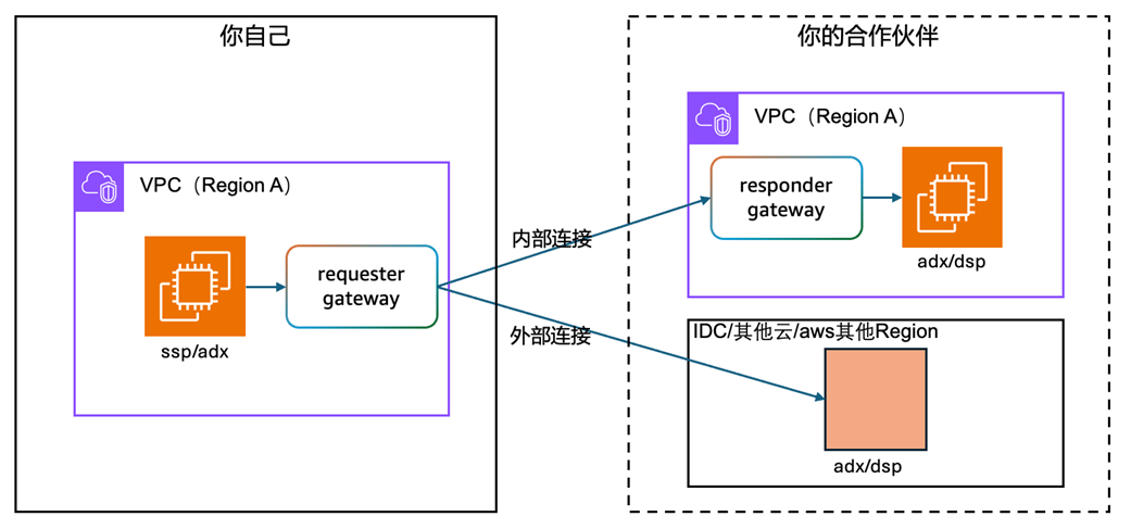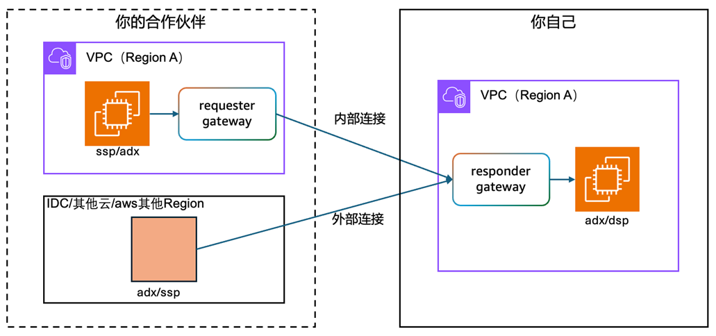 - 外部:指一方在AWS并且接入RTB Fabric,另一方没有接入同一个region的RTB Fabric网络,无论是否在AWS