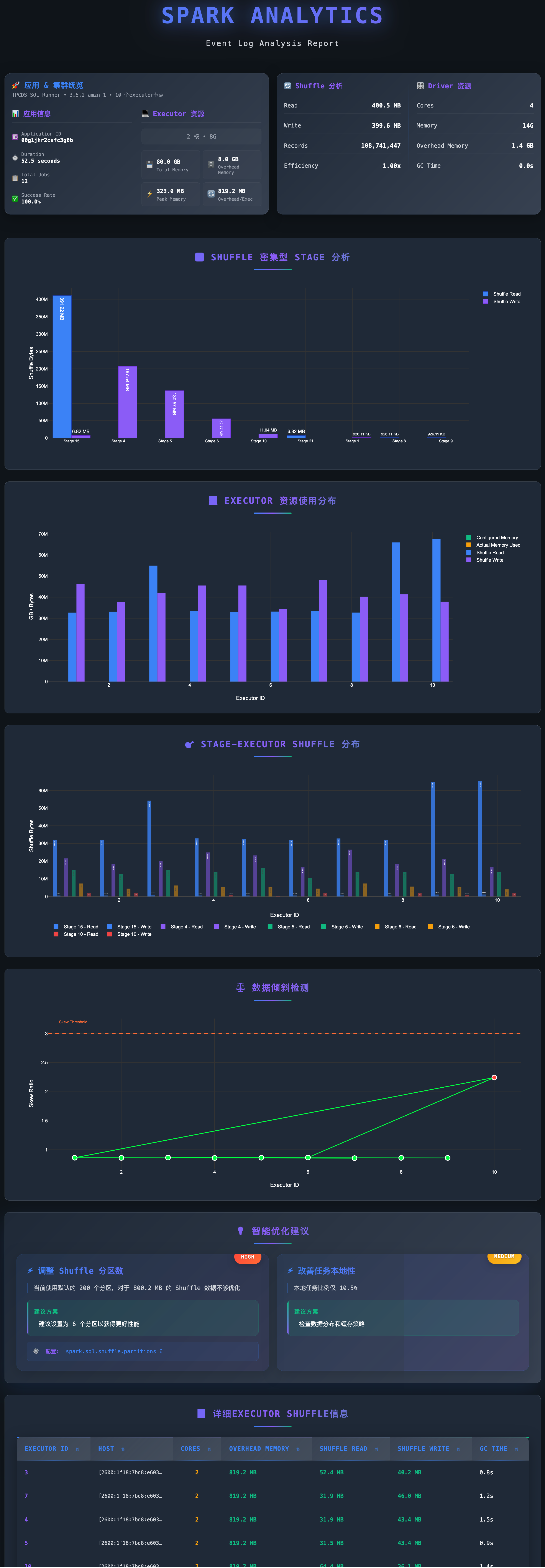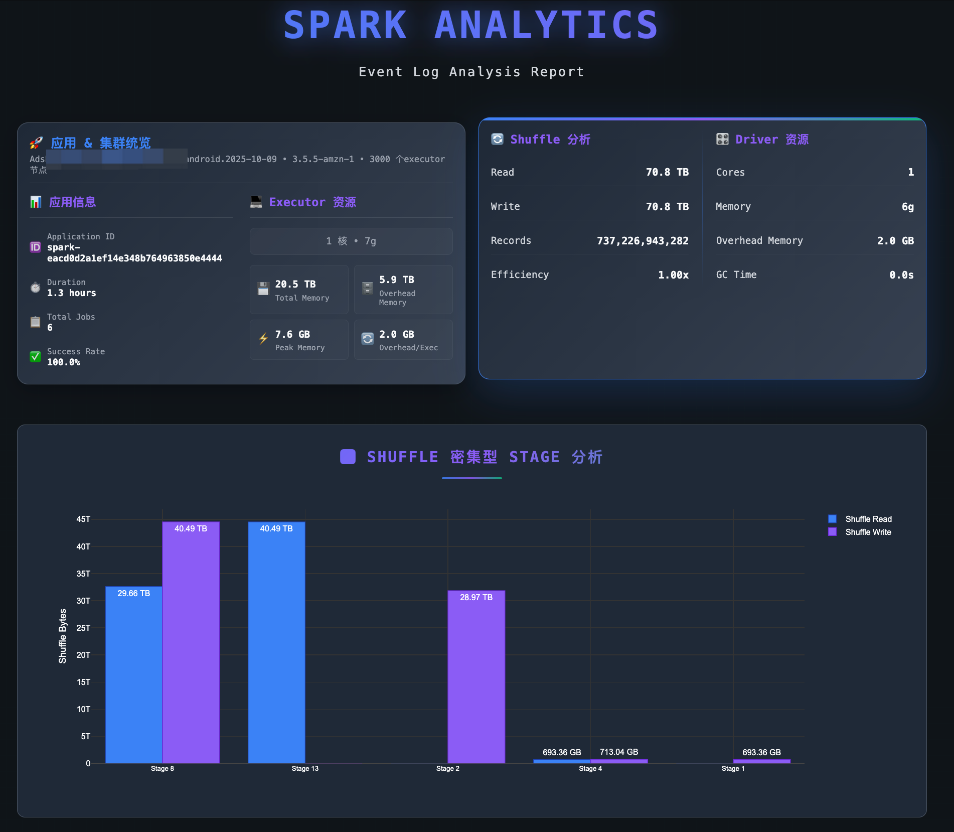 Analyzes Spark event logs from S3 to extract shuffle read/write metrics.