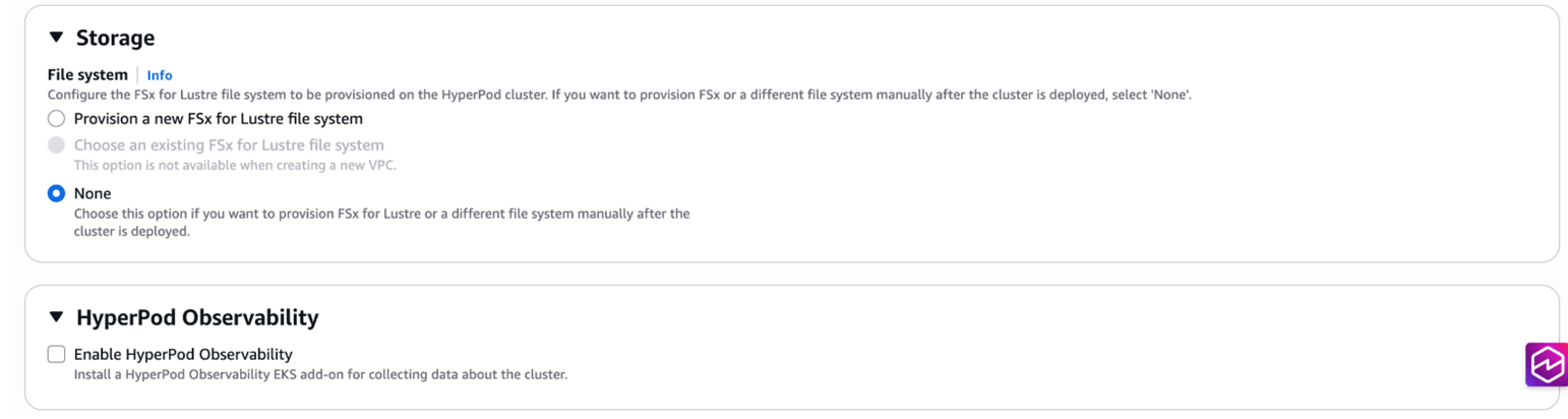 - Storage默认配置了FSx文件系统,在我们此次演示中暂时不需要,可以先设置为none;
