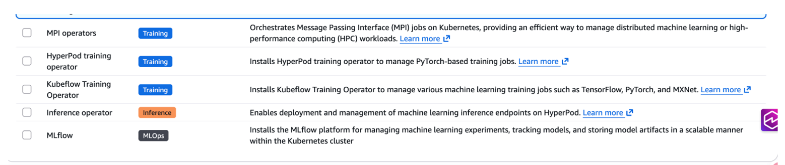 - 集群创建与配置:通过控制台创建 HyperPod Cluster,配置异构 GPU 节点组(如 g5.2xlarge 和 g6e.2xlarge),实现多种 GPU 实例在同一集群中的统一管理。