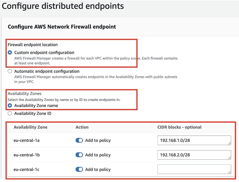 建议选择自定义 EP 的配置,按需选择多 AZ 的 HA 部署模式,可以自定义每个 EP 所属的 subnet 子网,或者 Firewall Manager 会自动按照 /28 的子网,从 VPC 中自动配置。