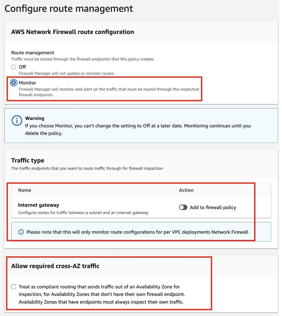 Firewall Manager具备帮助用户检查 / 检测 EP 所在子网中的路由缺失的功能,可以进一步防止流量没有经过 NFW 导致的策略没有生效的问题。比如可以帮助用户将与互联网 /IGW 之间的路由做添加,包括是否打开跨 AZ 等功能。